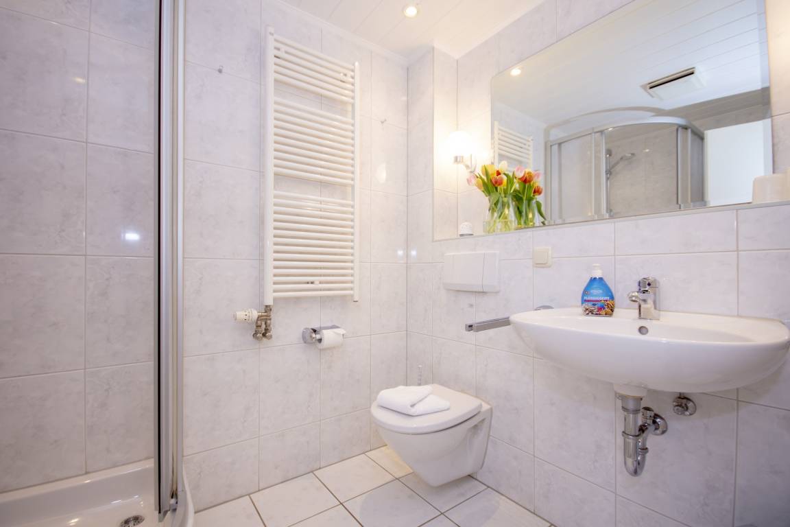 Das hell erleuchtete Badezimmer verfügt über eine Dusche, WC und einen Waschtisch mit großen Spiegel.