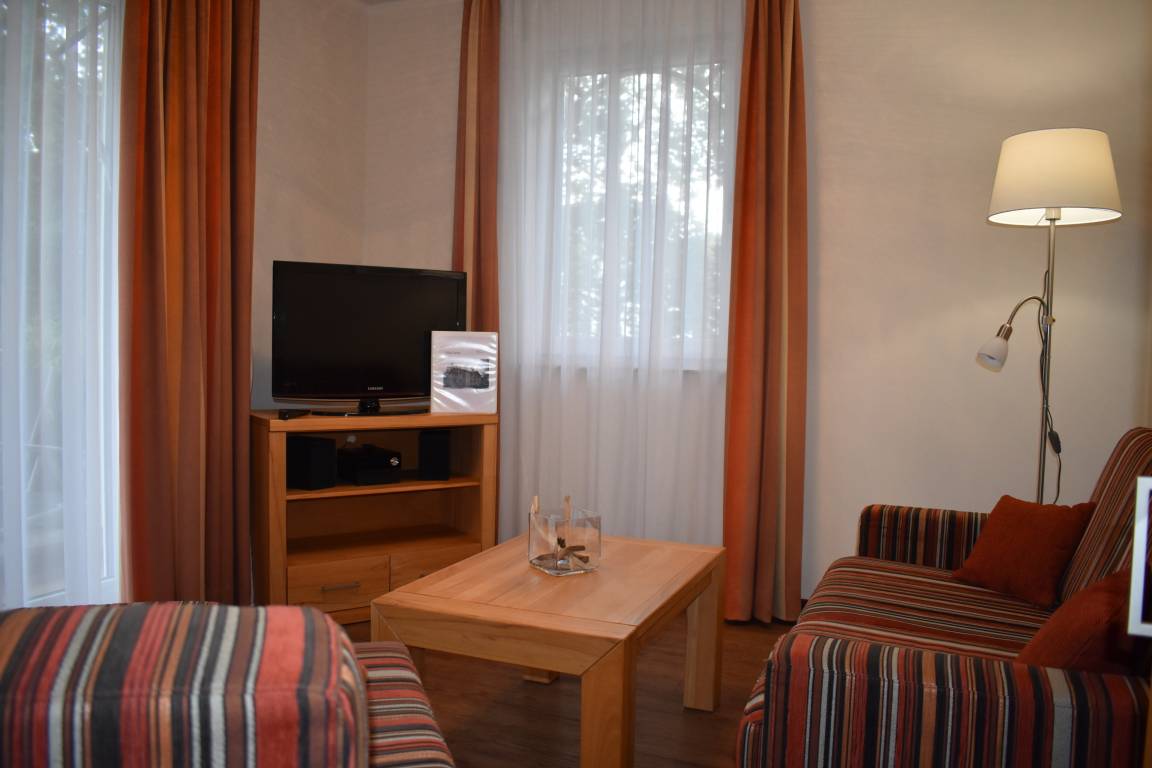 Das Wohnzimmer verfügt über eine gemütliche Sitzgarnitur mit Sofa und Sessel. Ein TV und eine Musikanlage sind natürlich vorhanden. Die Küchenzeile ist komplett ausgestattet. Hier finden sie alles was sie brauchen. Backofen, Ceranfeld, Mikrowelle, Geschirrspüler sind vorhanden. Im Küchenbereich befindet sich auch ein großer Esstisch, wo die ganze Familie Platz findet. Das Elternschlafzimmer verfügt über ein großes Doppelbett. Dort befindet sich auch ein zweiter TV. Im zweiten kleineren Schlafzimmer befinden sich zwei Einzelbetten. Zur Wohnung gehört auch eine 18 qm große Terrasse. Dort kann man in ruhe die Sonne genießen. Balkonmöbel und Liegen sind vorhanden.