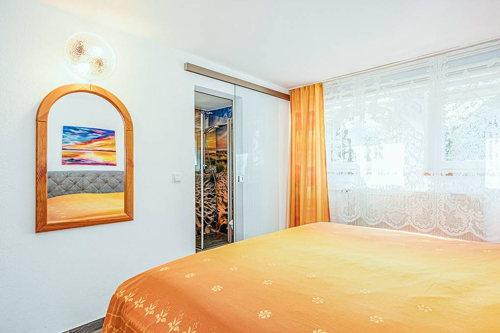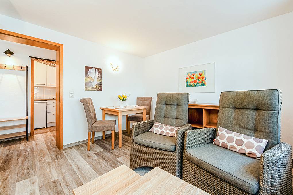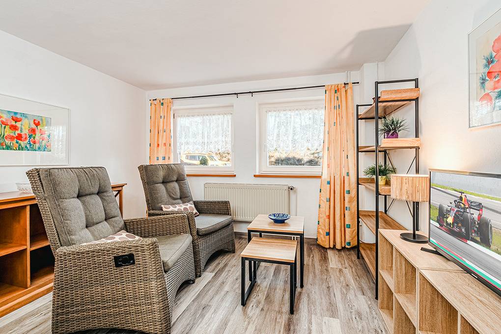D 92.125 Wohnung 2 Pers.: 2-Zimmerwohnung mit 30 qm Wohnfläche, Parterre. Wohnraum mit Sitzgarnitur, Esstisch, Sat-TV. Kochnische mit Pantry-Küche. Freundliches Doppelzimmer. Bad/WC.