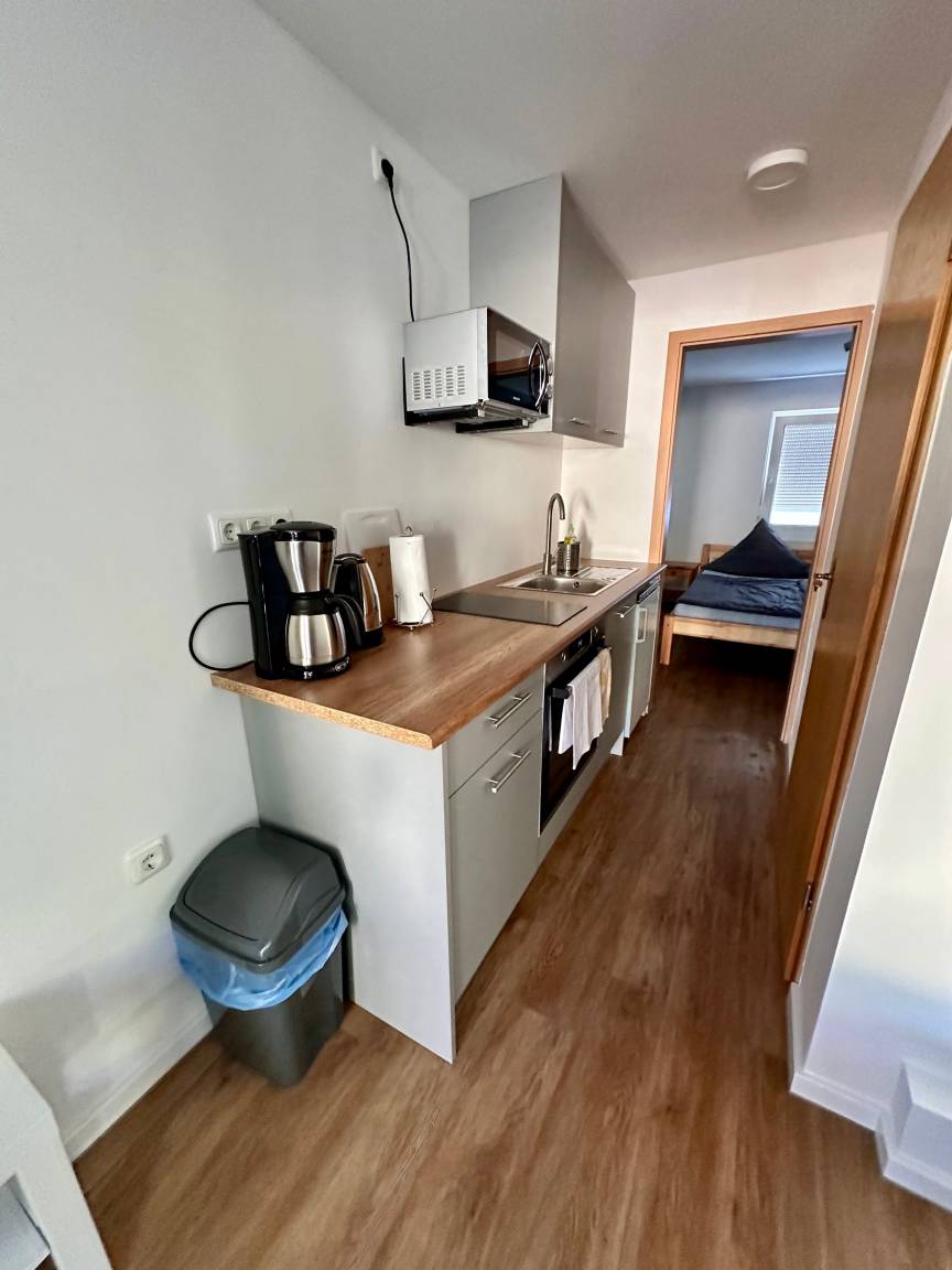 Im Nebenhaus dahinter erwarten sie vier Sparferienwohnungen mit einer Größe von 22qm, Schlafplätze für bis zu 3 Personen und kleiner Terrasse. Hier gilt das Motto: klein aber fein und ist für alle die gedacht, die viel unterwegs sind und fast nur zum Schlafen in die Unterkunft kommen. Eine Sparwohnung, Nr.1 ist mit Einzelbetten und drei, Nr.2, 3 und 4, mit Doppelbett ausgestattet.