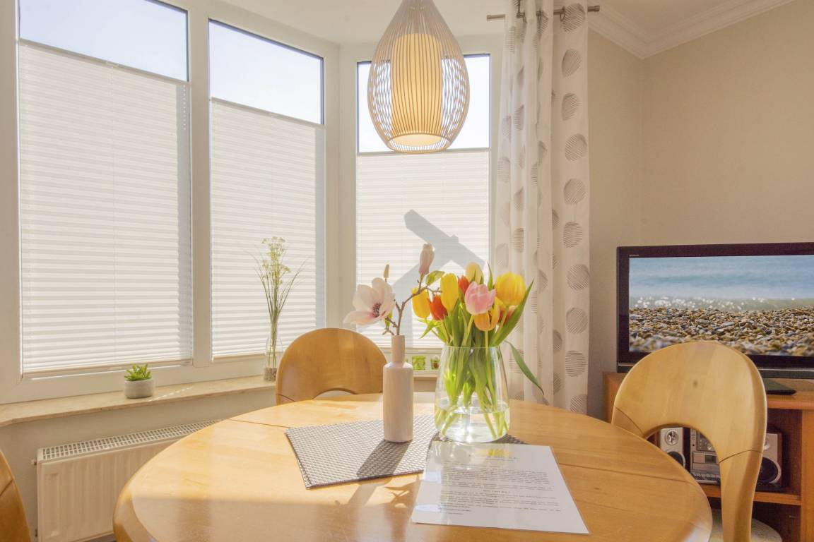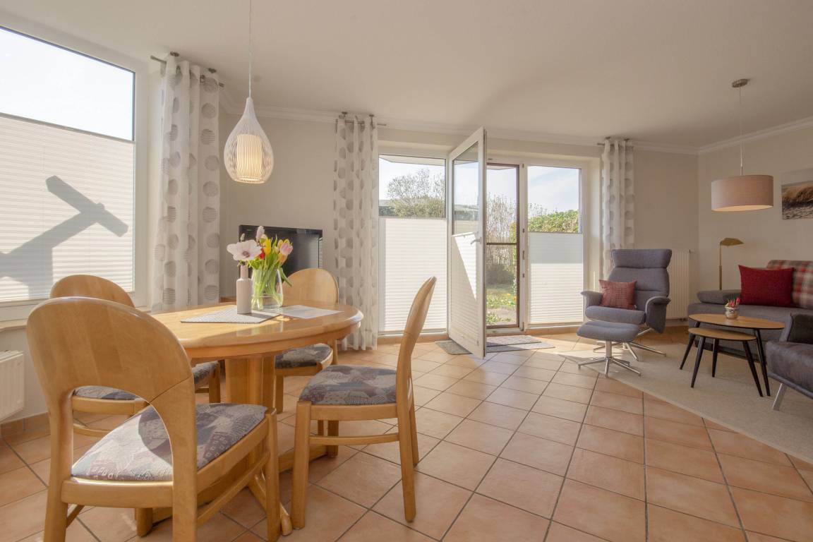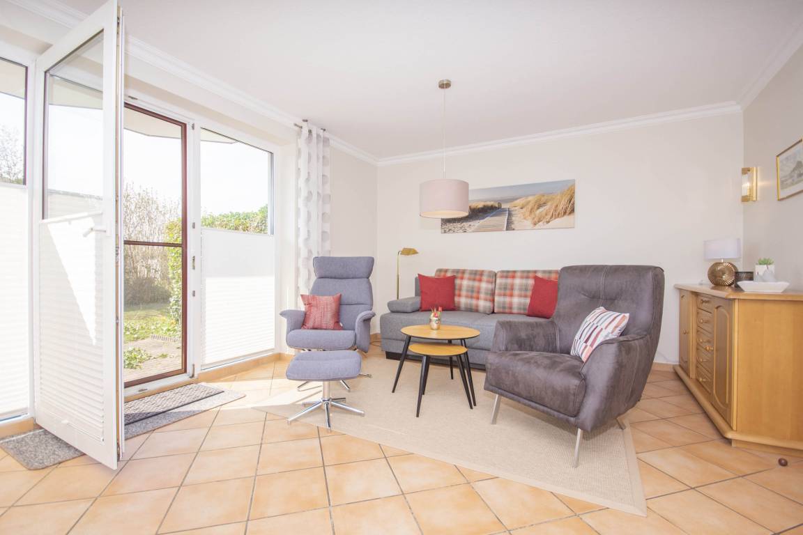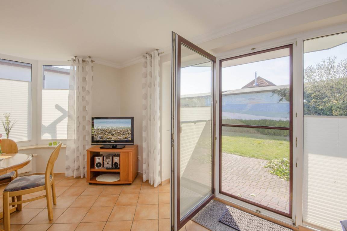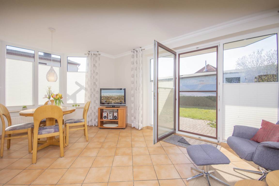 Der freundliche Wohnbereich bietet einen gemütlichen Ort zum Ausklingen der erlebnisreichen Tage auf Rügen. Hier befindet sich neben einem modernen Flachbild-TV auch eine außerordentlich komfortable Couchgarnitur, die eine optionale Aufbettung für bis zu 2 weitere Personen darstellt. Von diesem Zimmer erhalten Sie einen direkten Zugang auf die eigene Terrasse, welche mit komfortablen Gartenmöbeln ausgestattet ist. Hier können Sie nach einem erlebnisreichen Strandtag in Baabe einfach mal die Seele baumeln lassen.
