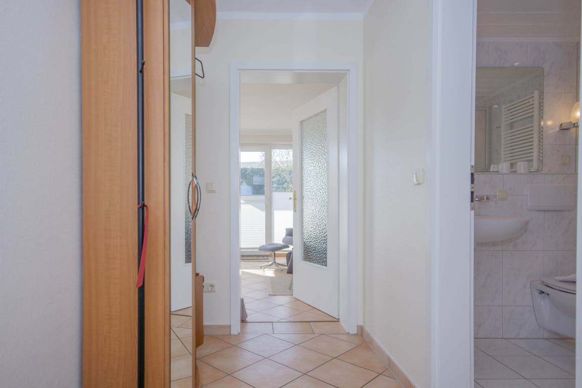 Die Ferienwohnung 3 im Erdgeschoss im Haus Rügensonne verfügt über einen freundlichen Eingangsbereich, eine sonnige Terrasse, einen gemütlichen Wohnbereich und ein separates Schlafzimmer.
