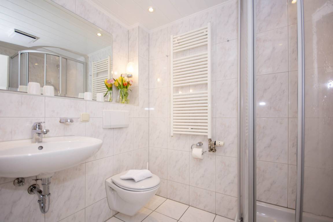 Das hell erleuchtete Badezimmer verfügt über eine Dusche, WC und einen Waschtisch mit großen Spiegel.