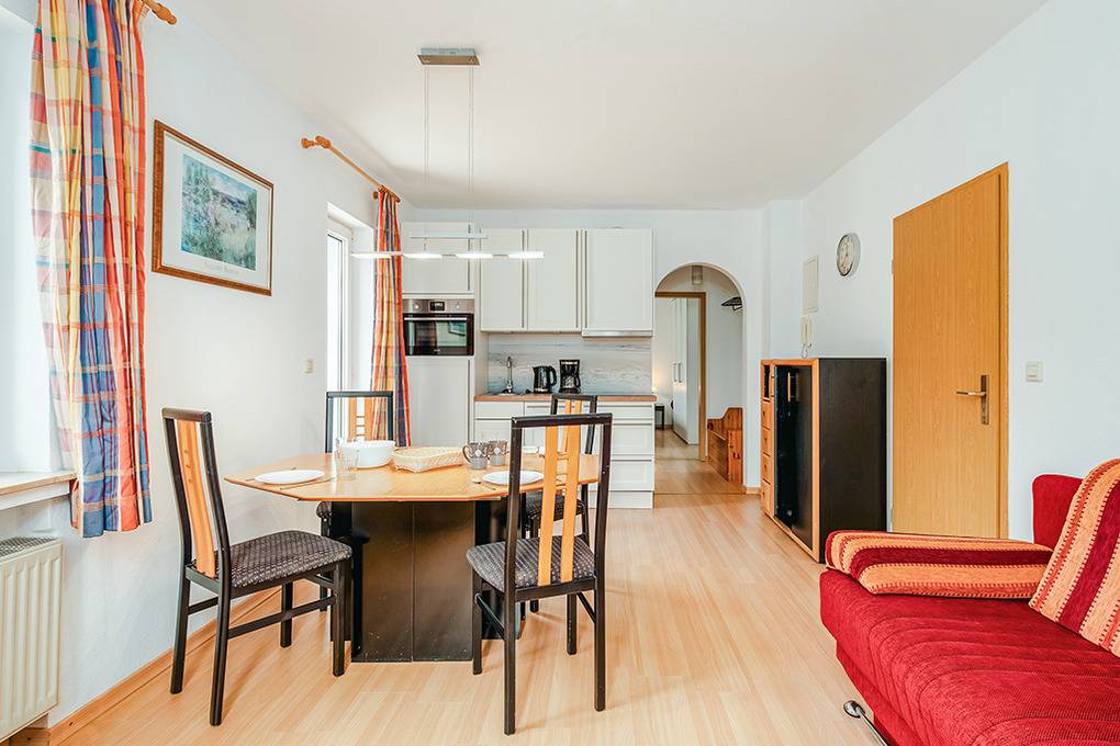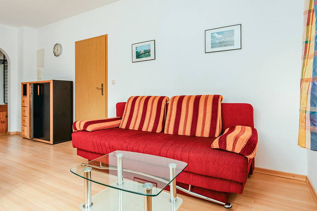 D 92.5 Wohnung 2-4 Pers.: Schöne 2-Zimmerwohnung mit 40 qm Wohnfläche. Wohnraum mit Sofa (Ausziehcouch 2 Pers.), Sat-TV, Esstisch, moderner Küchenzeile (Backofen, Spülmaschine). Doppelzimmer. Bad/ WC. Balkon mit Sitzmöbeln.