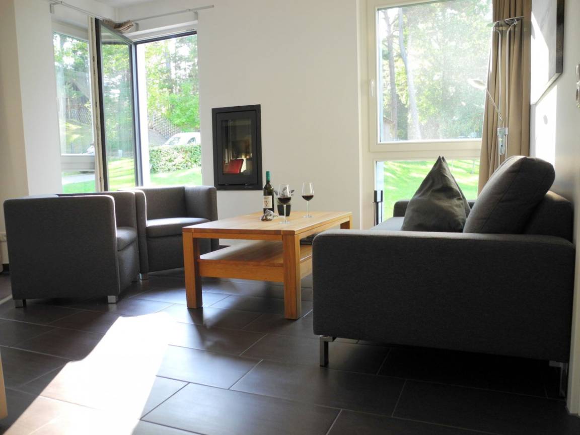 Im liebevoll eingerichteten Wohnbereich befinden sich ein bequemes Sofa sowie zwei gemütliche Sessel. Ein Kamin sorgt für eine romantische Atmosphäre und bietet zusätzlich angenehme Wärme an Herbst- oder Wintertagen.