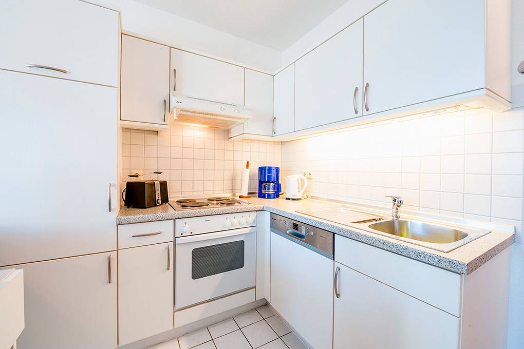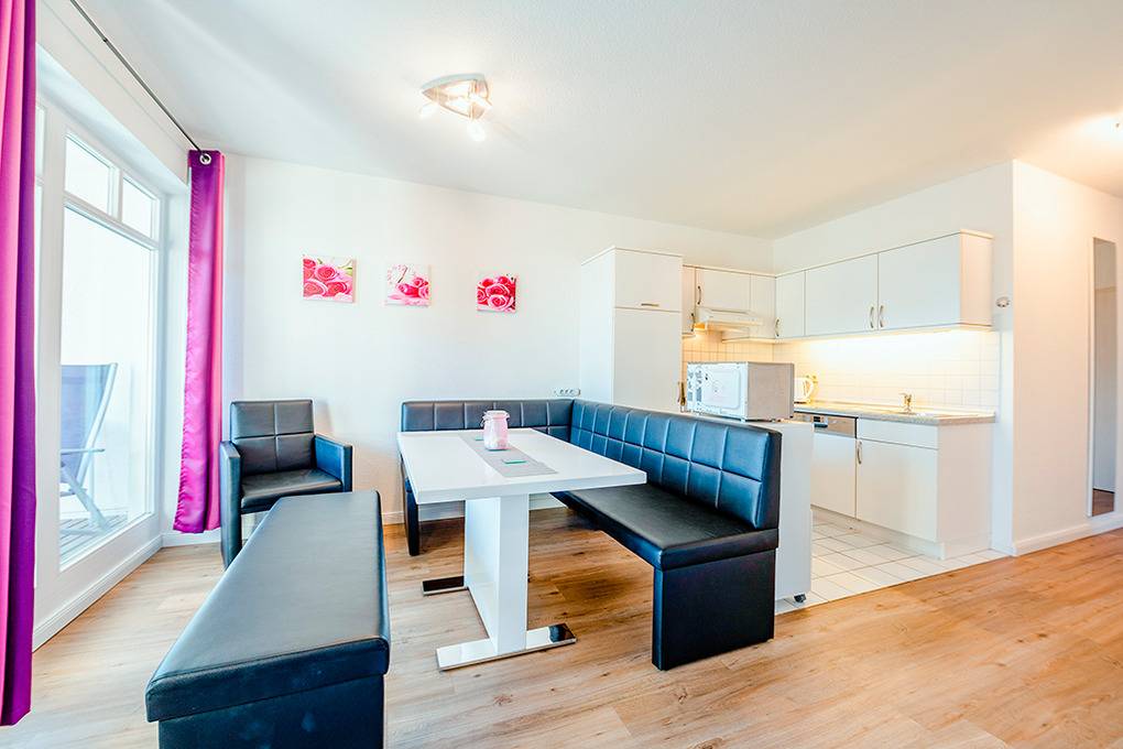 D 92.10 Wohnung 2-5 Pers.: 2-Zimmerwohnung mit 54 qm Wohnfläche, 1. Etage. Großer Wohn-/Essraum (27qm) mit Sitzgarnitur (Ausziehcouch 2 Pers., Klappcouch 1 Pers.), Flachbild-Sat-TV, Stereoanlage, Esstisch, abgetrenntem Küchenbereich (Backofen, Mikrowelle, Spülmaschine). Doppelzimmer. Bad/WC. Großer Balkon (10 qm) mit Sitzmöbeln.