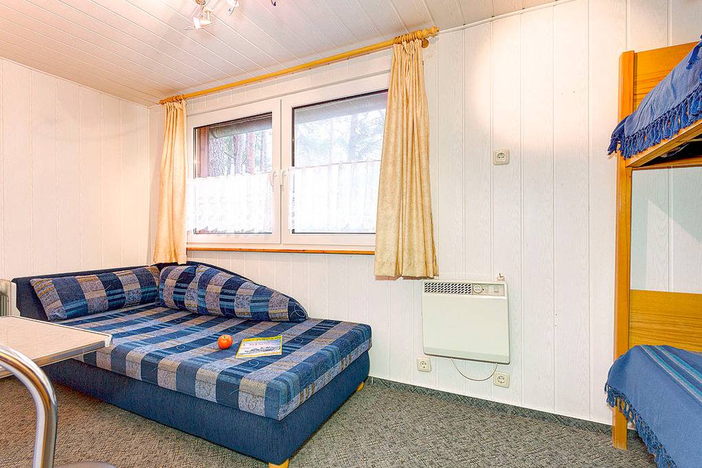 D 92.85 Bungalowhälfte 2-5 Pers.: Geräumiger 3-Zimmerbungalow mit 45 qm Wohnfläche. Wohn-/Essraum mit Essecke, Sat-TV, Radio, Küchenzeile (Backofen, Mikrowelle/Grill). Doppelzimmer. Kleines 2-Bettzimmer mit Etagenbett und Schlafcouch (1 Pers.), Bad/WC.