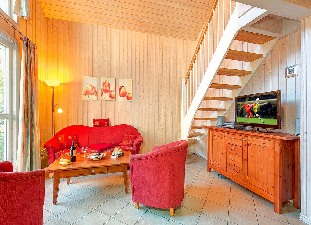 D 92.66 Ferienhaus 4-8 Pers.: Komfortables 4-Zimmerhaus, 95 qm Wohnfläche über 2 Etagen. Parterre: Heller, freundlicher Wohn-/Essraum mit Kaminofen, Couchgarnitur, Sat-TV, DVD, Radio/CD, Esstisch, moderner Einbauküche (Backofen, Mikrowelle, Spülmaschine). Doppelzimmer. Bad: Sauna, Bw, Du, Wb, WC, Waschmaschine. Vom Wohnraum Treppe in die 1. Etage: hübsche Galerie mit kleiner Sitzgruppe (Schlafcouch 2 Pers.). Doppelzimmer. 2-Bettzimmer. Bad/WC.