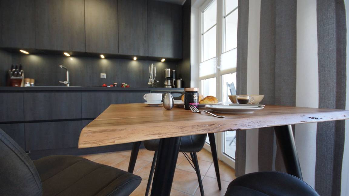 Nach Betreten des hellen Flurbereichs erreichen Sie direkt das freundliche Wohnzimmer. Dort steht Ihnen eine bequeme Couchgarnitur (155 x 200 cm, hier ist eine Aufbettung für eine weitere Person möglich) und ein einladender Essbereich zur Verfügung. Der Flachbild-TV und der kostenfreie WLAN-Zugang runden das Gesamterlebnis ab.