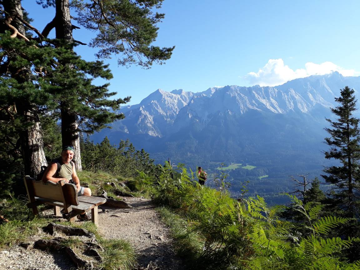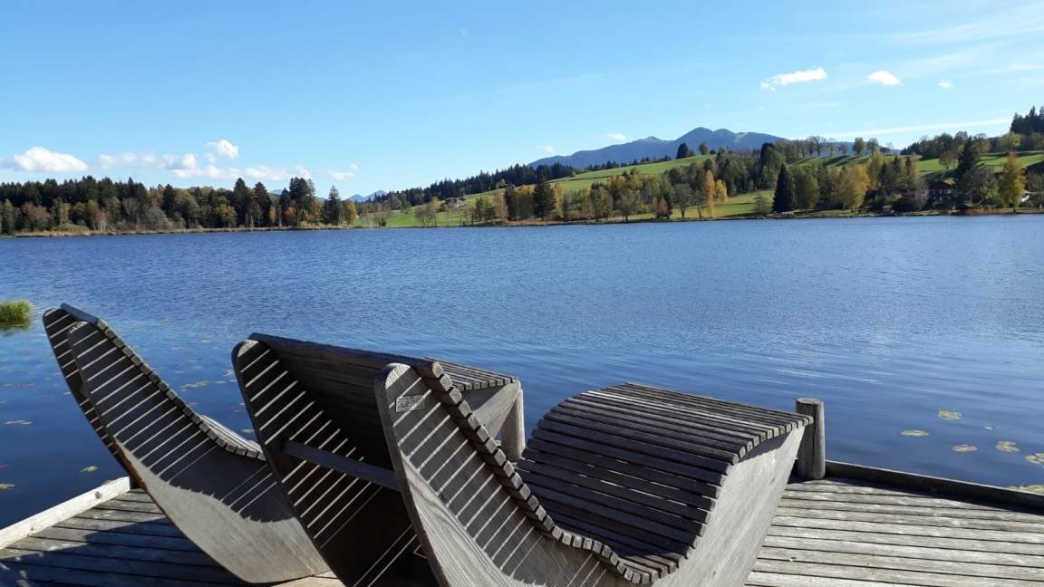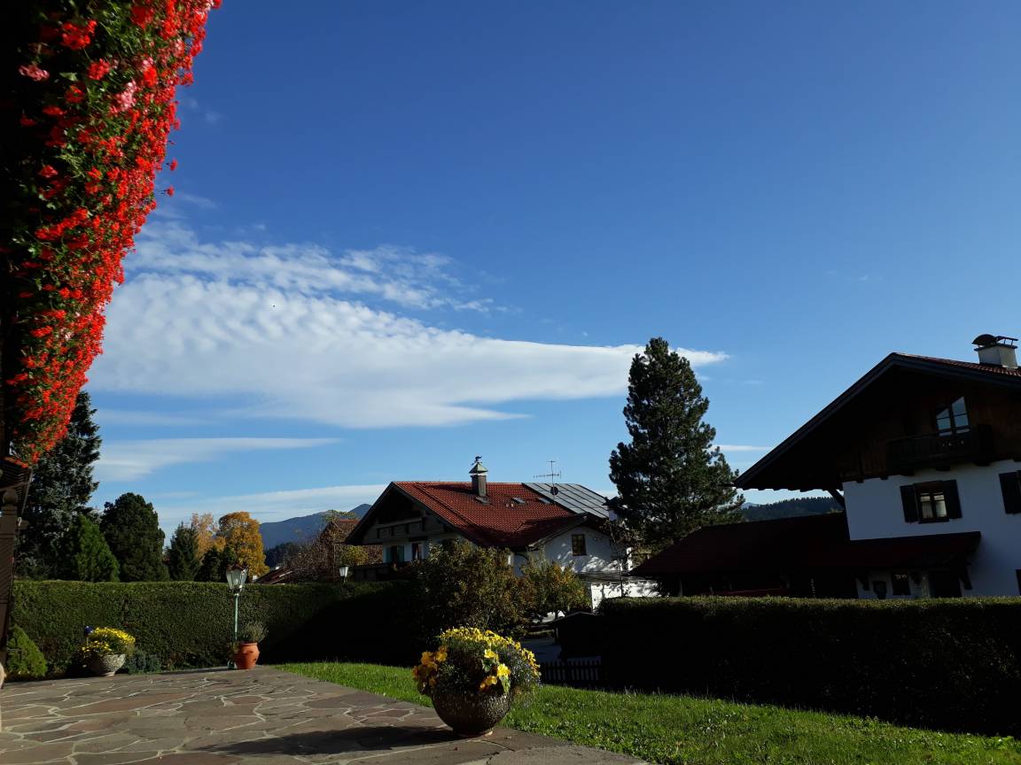 Das 23 m² große Zimmer befindet sich im Erdgeschoss und verfügt über eine große Terrasse Richtung Süden zur Gartenseite, mit Blick auf die Ammergauer Berge.