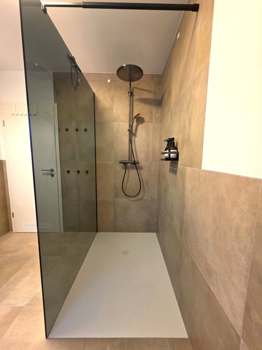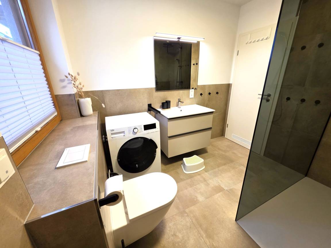 Das Badezimmer wurde modernisiert und mit einer Duschkabine aus Glas ausgestattet. Außerdem steht eine Waschtrocknerkombination kostenlos zur Verfügung, sodass Sie nicht Unmengen an Kleidung mitnehmen müssen.