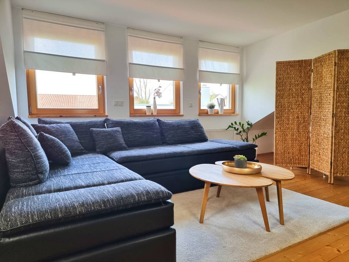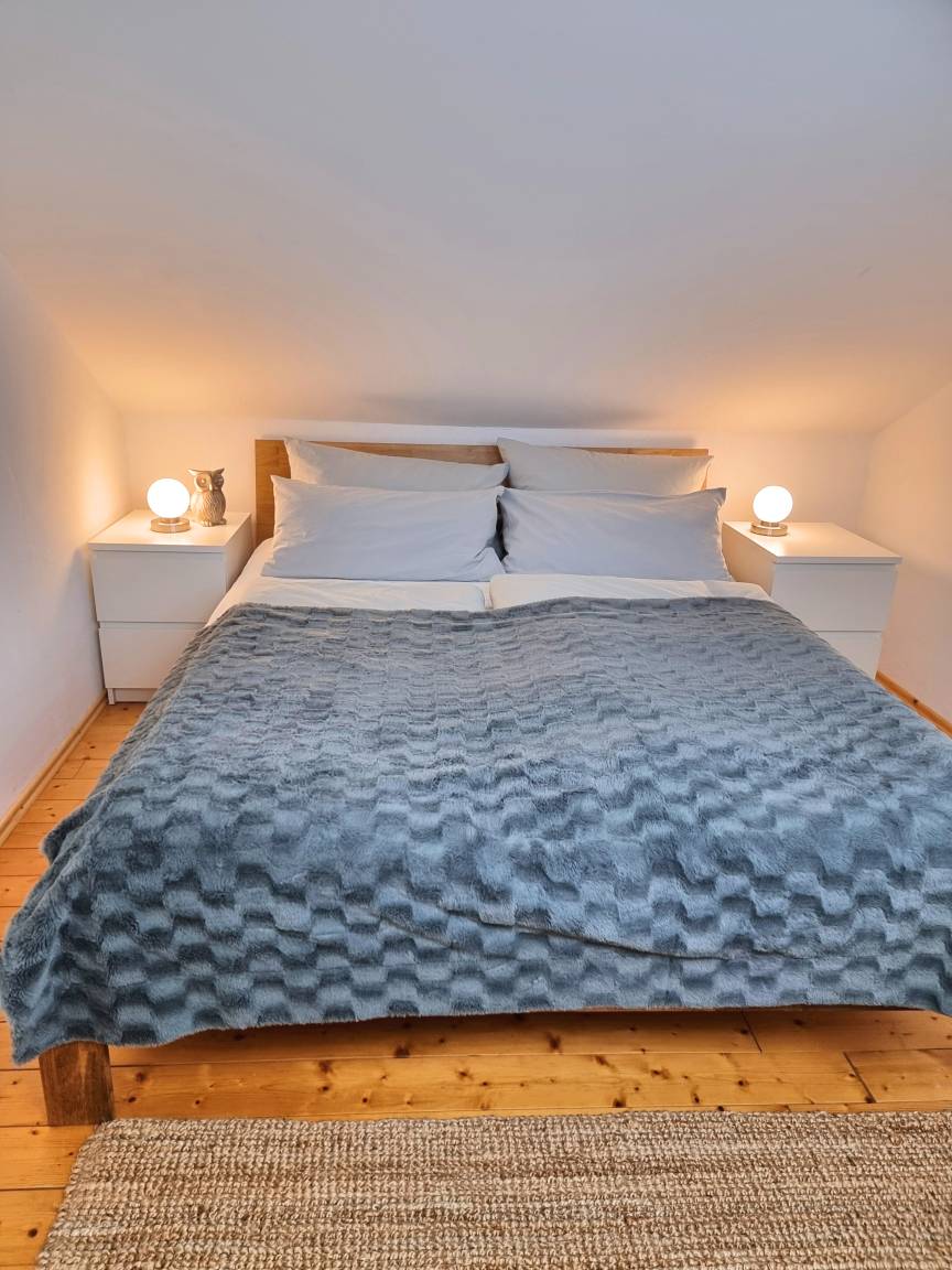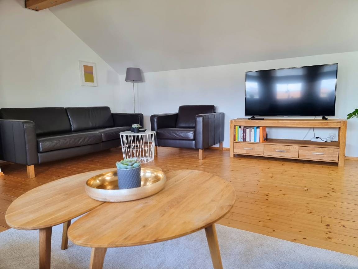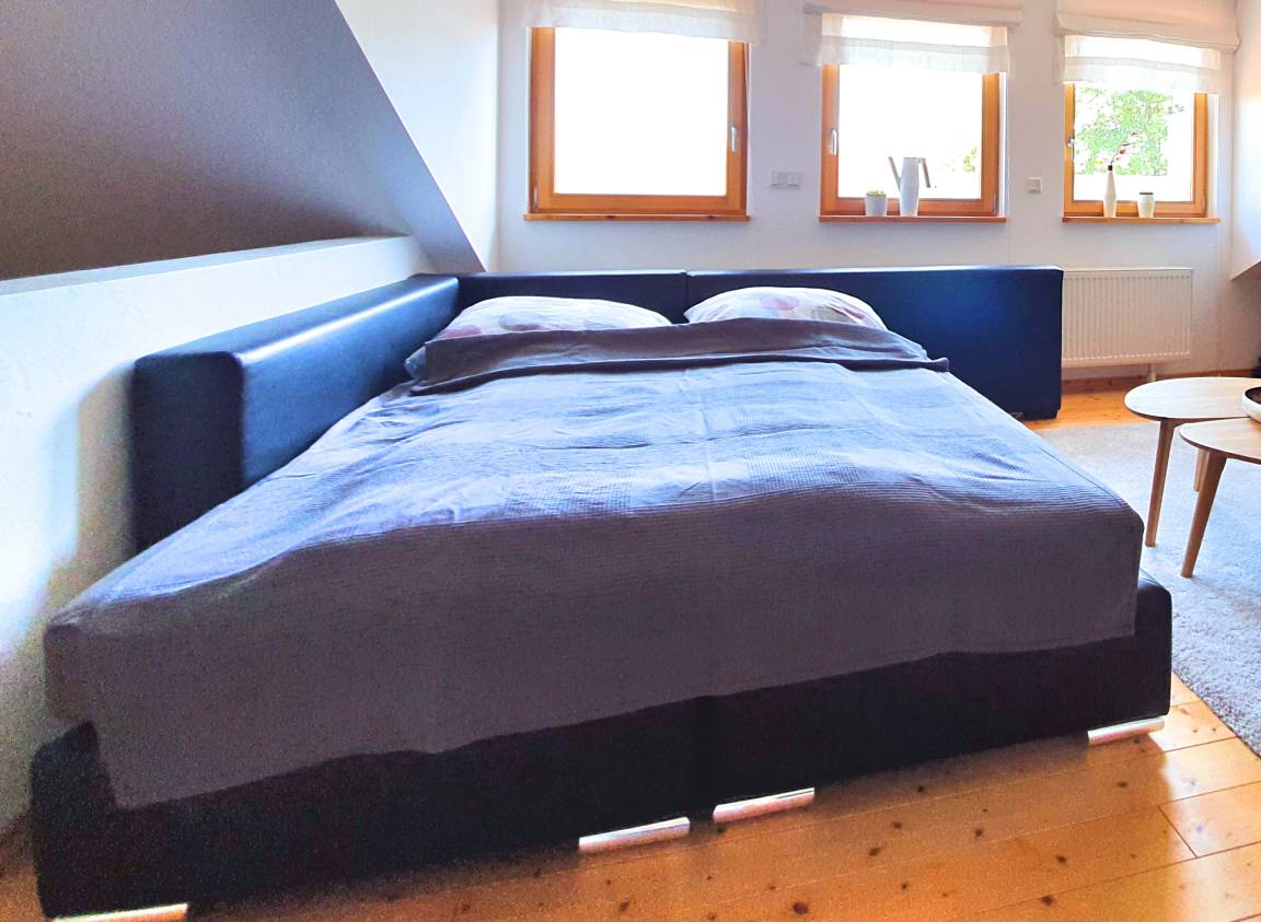 Im Obergeschoss befindet sich ein weiteres Schlafzimmer mit einem Doppelbett (160 x 200) und einem Beistellbett (90 x 200), sowie das Wohnzimmer mit einer bequemen Schlafcouch (Boxspringbett 160 x 200 cm).