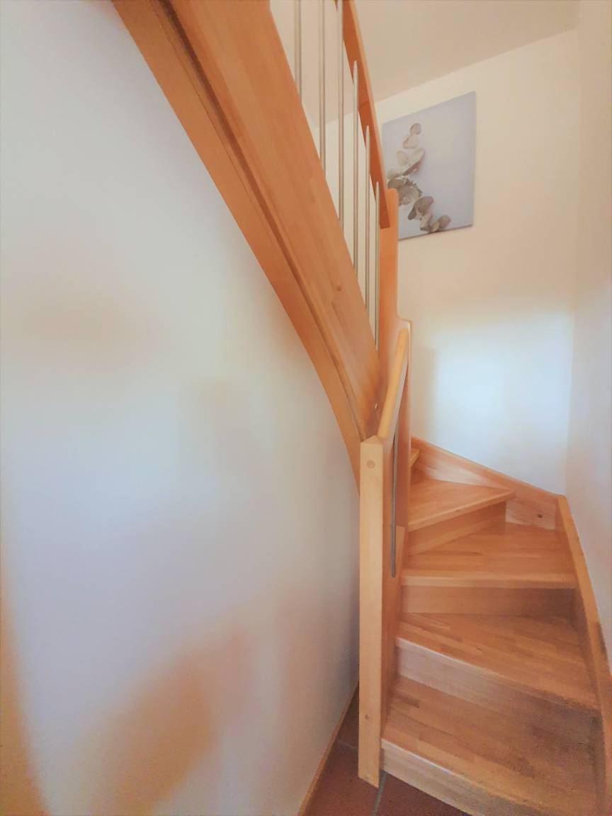 Die Treppe, die die beiden Stockwerke miteinander verbindet, kann mit einem Treppengitter versehen werden, so dass auch die kleinen Gäste sicher im Haus unterwegs sind.