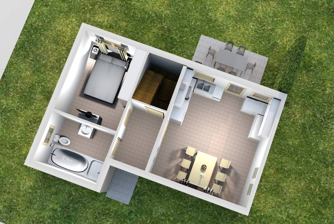 Im Erdgeschoss befinden sich ein Schlafzimmer mit einem Boxspringbett (160 x 200), ein Tageslichtbad sowie eine großzügig geschnittene Küche mit Essbereich.