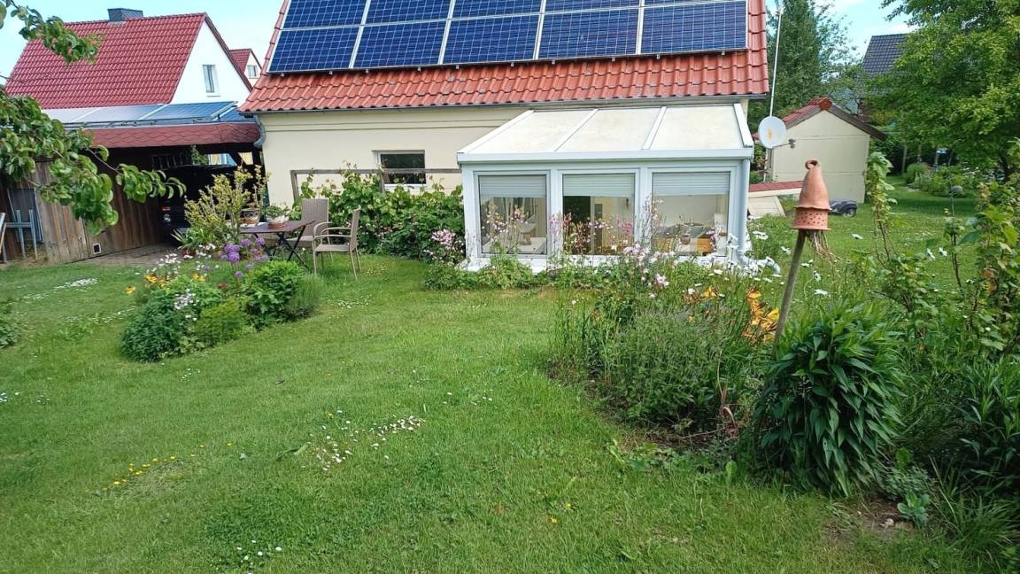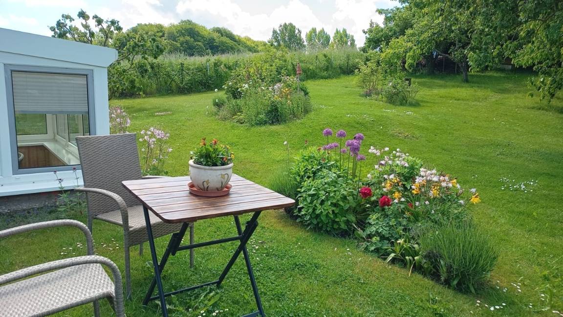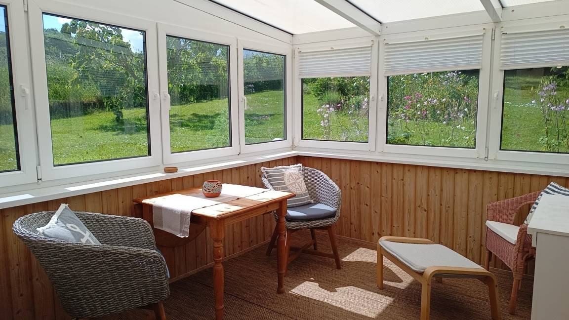 Im Freien ist neben dem Wintergarten umgeben von Blumenbeeten ein Sitzplatz für 2 Personen angelegt. Sie können im hinteren Gartenteil aber auch Schattenplätze unter den alten Obstbäumen suchen.