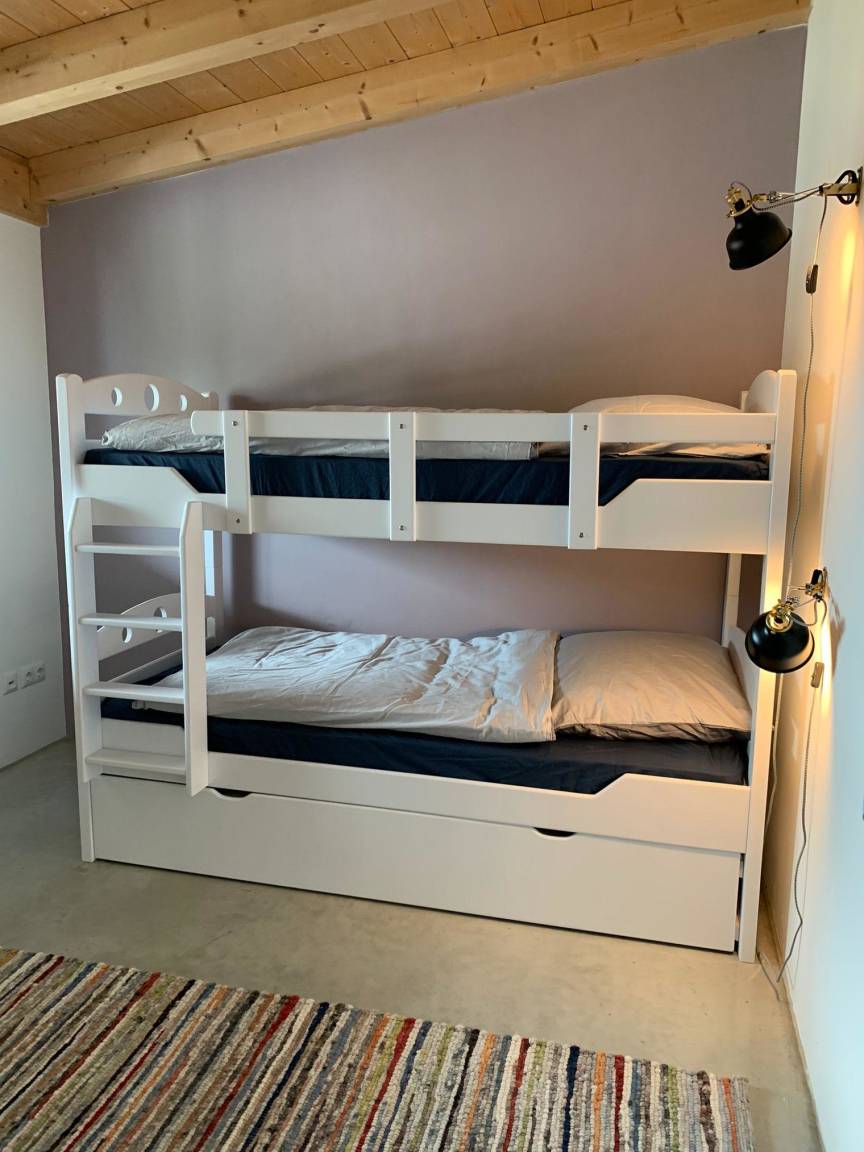 Die 85qm große Loftwohnung ist offen geschnitten und bietet Platz für bis zu 5 Personen (maximal 4 Erwachsene). Sie verfügt über ein komfortables Schlafzimmer mit einem Doppelbett und Zugang zu einem großzügigen Balkon sowie ein Kinderzimmer mit Etagenbett (jeweils 90/200 cm), welches ausziehbar ist und somit eine weitere Schlafgelegenheit bietet. Im gemütlichen Wohnzimmer findet sich zudem eine ausziehbare Schlafcouch. In der voll ausgestatteten offenen Küche mit Essbereich können Sie Ihre Mahlzeiten bequem in der Wohnung zubereiten. Im Badezimmer befindet sich eine bodenebene Dusche sowie eine Badewanne. Ein Waschtrockner steht in der Wohnung.
