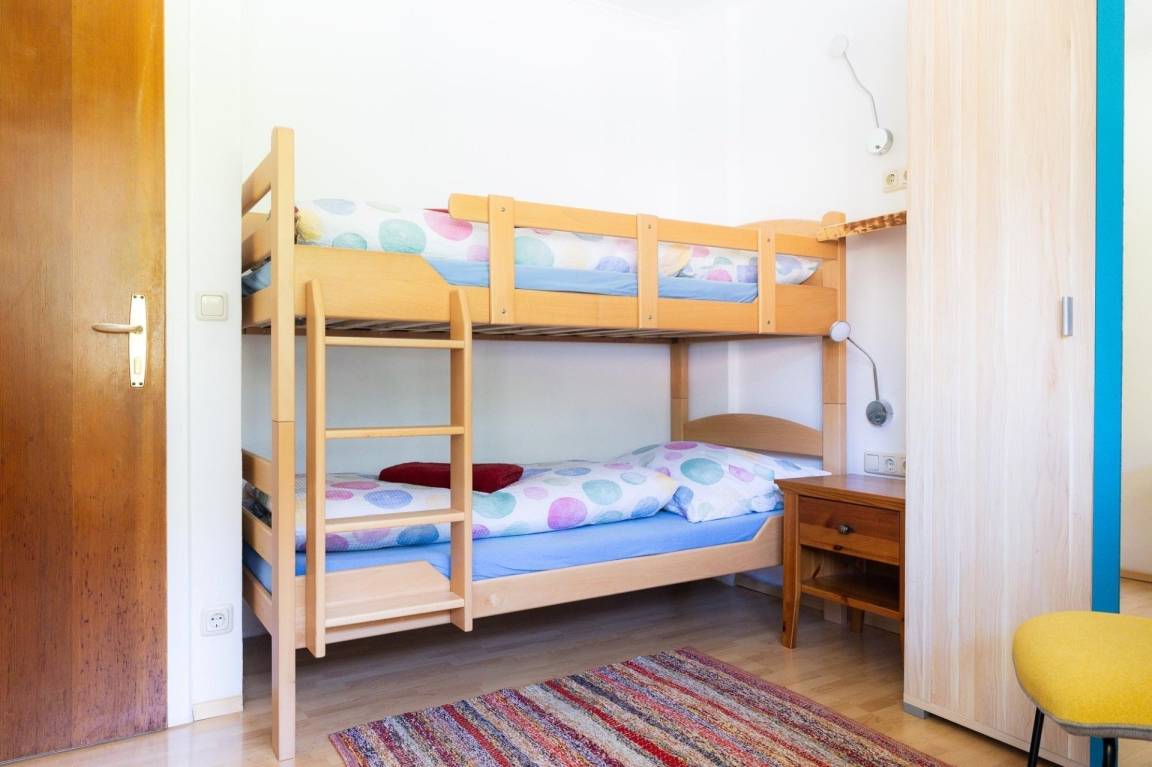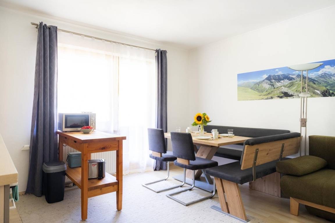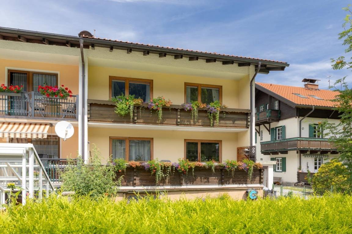 Das Appartement Schareckblick befindet sich im Obergeschoß eines Reihenhaus-Fünftels. Die Wohnung besteht aus einem großen Schlafzimmer mit Doppelbett, einem kleineren Schlafzimmer mit einem für Erwachsene geeignetem Etagenbett sowie einer Wohnküche mit einer Schlaf-Couch für weitere zwei Personen. Ein getrenntes Bad und WC runden das Angebot ab. Zusätzlich gibt es noch eine ca. 8 qm große, südseitige Loggia.