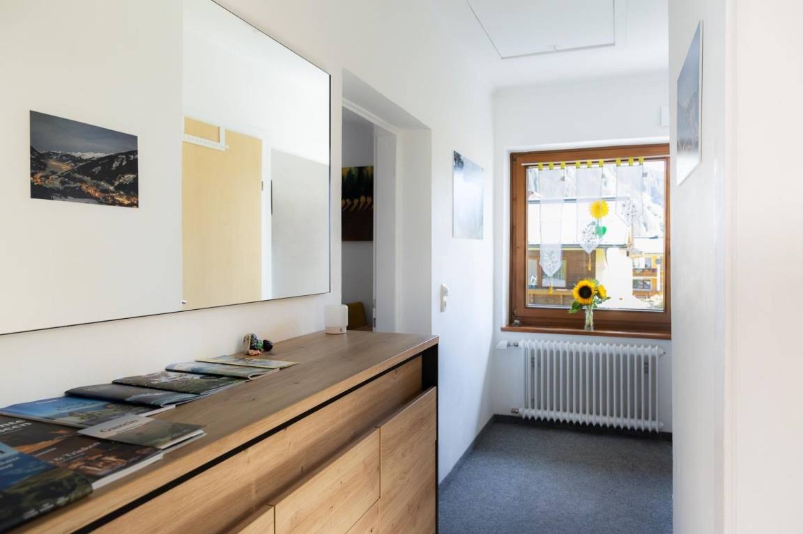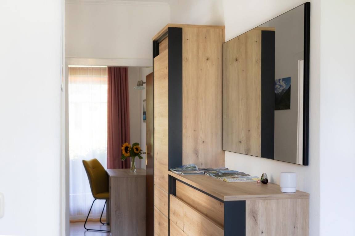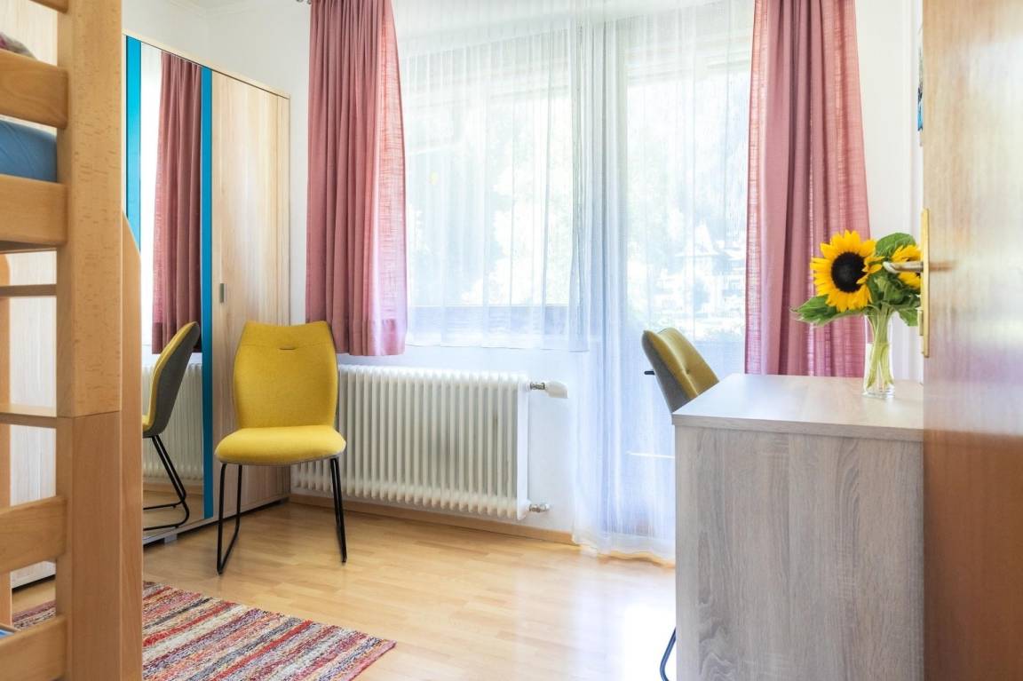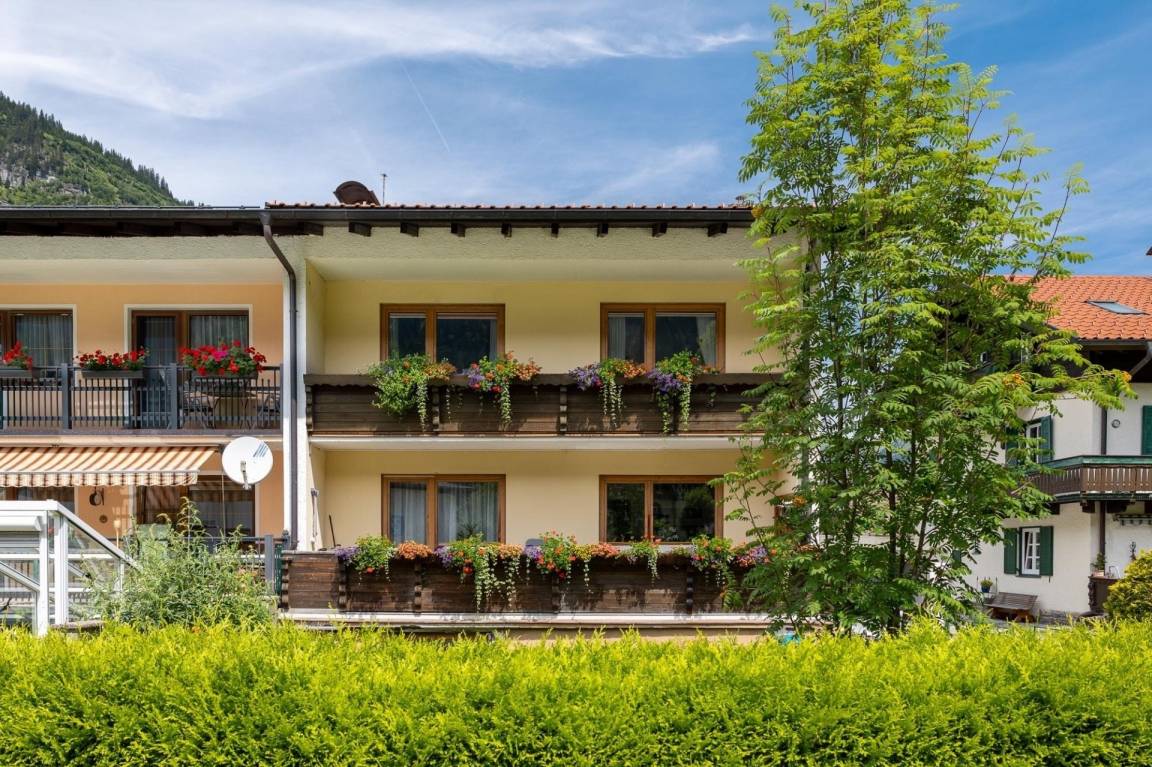 Das Appartement Schareckblick befindet sich im Obergeschoß eines Reihenhaus-Fünftels. Die Wohnung besteht aus einem großen Schlafzimmer mit Doppelbett, einem kleineren Schlafzimmer mit einem für Erwachsene geeignetem Etagenbett sowie einer Wohnküche mit einer Schlaf-Couch für weitere zwei Personen. Ein getrenntes Bad und WC runden das Angebot ab. Zusätzlich gibt es noch eine ca. 8 qm große, südseitige Loggia.