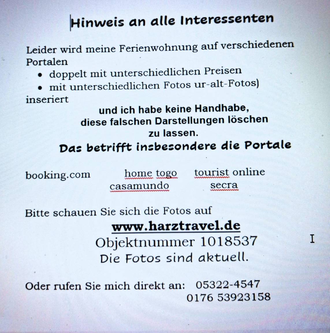 Aber die Fälle der Absagen häufen sich immer mehr und ich habe durch Absagen zu viele Leer-Zeiten, weil Absagen meistens ganz kurzfristig erfolgen und eine Ersatz-Vermietung in den meisten Fällen dann nicht mehr möglich ist. Sollte eine Ersatzbuchung erfolgen, nehme ich selbstverständlich eine Erstattung vor.
