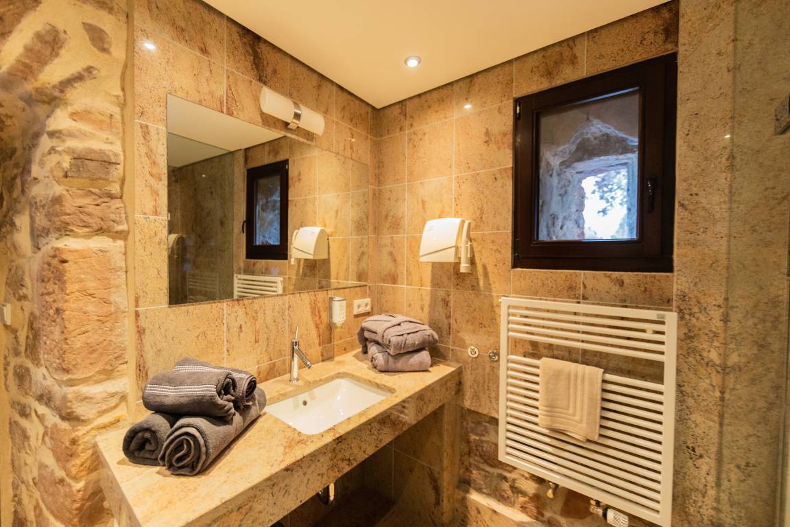 Los gehts im Erdgeschoss mit dem großzügigen und hochwertigen Naturstein-Badezimmer inkl. Fußbodenheizung sowie ebenerdiger Dusche, Handwaschbecken- und einer separaten Toilette. Hier befindet sich auch der östliche Wohnungseingang, direkt am hauseigenen Parkplatz vor dem Turm.