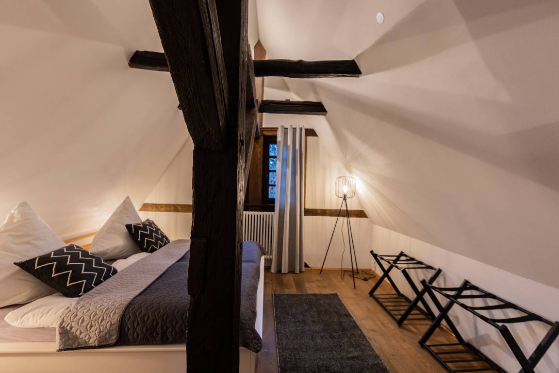 Im 3. Obergeschoss befindet sich das Schlafzimmer (Giebel) mit Doppelbett.