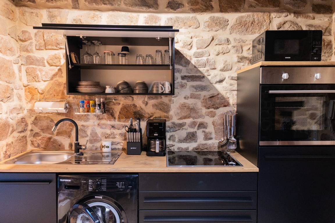 Im Zwischengeschoss befindet sich der westliche Wohnungseingang welcher direkt in den angrenzenden Stadtpark führt. Von hier aus gelangst du auch in das 1. Obergeschoss, wo sich die voll ausgestattete Küche inkl. kleinem Bartisch und Stühlen befindet.