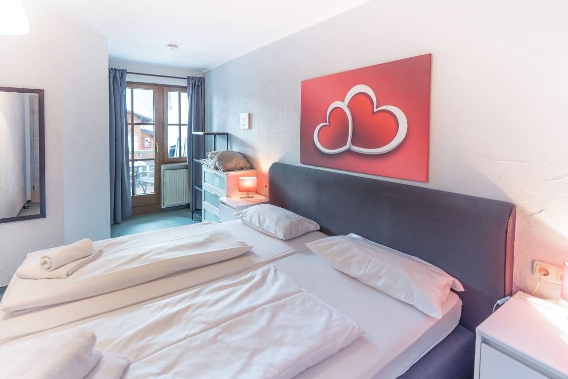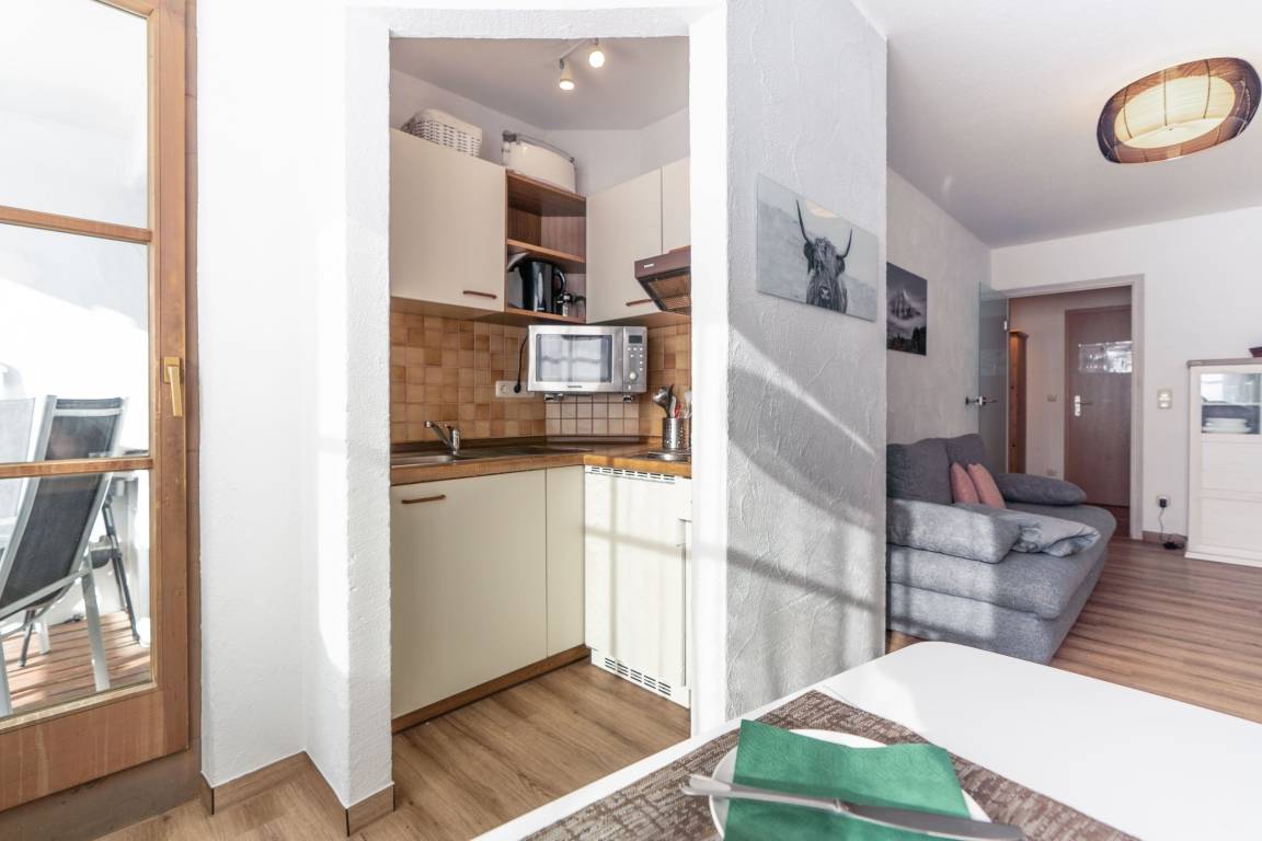 Das Wohnzimmer mit Schlafcouch ist mit einem Essbereich und Küche kombiniert. Von hier aus können Sie den Balkon betreten, der Sie mit seinen phantastischen Blick in die Allgäuer Bergwelt zum entspannen einlädt. Bei einem Glas Wein können Sie dort den Tag wunderbar ausklingen lassen. Das Schlafzimmer ist mit einem Doppelbett ausgestattet, auch von hier aus haben Sie Zugang zum Balkon. Im Bad finden Sie eine große Dusche, WC und einen Föhn vor.