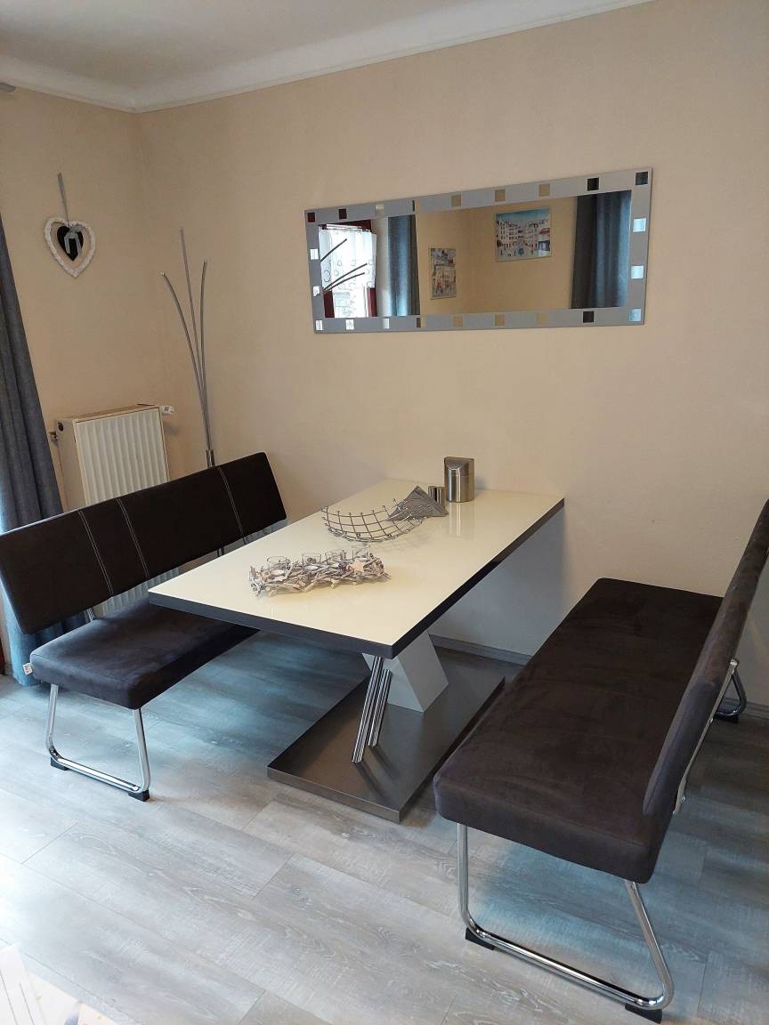 Das Wohnzimmer verfügt über eine schöne Wohnlandschaft, einen modernen Essbereich und natürlich einen grossen Fernseher. Die Wohnlandschaft ist ausziehbar und ist dann als Bett nutzbar