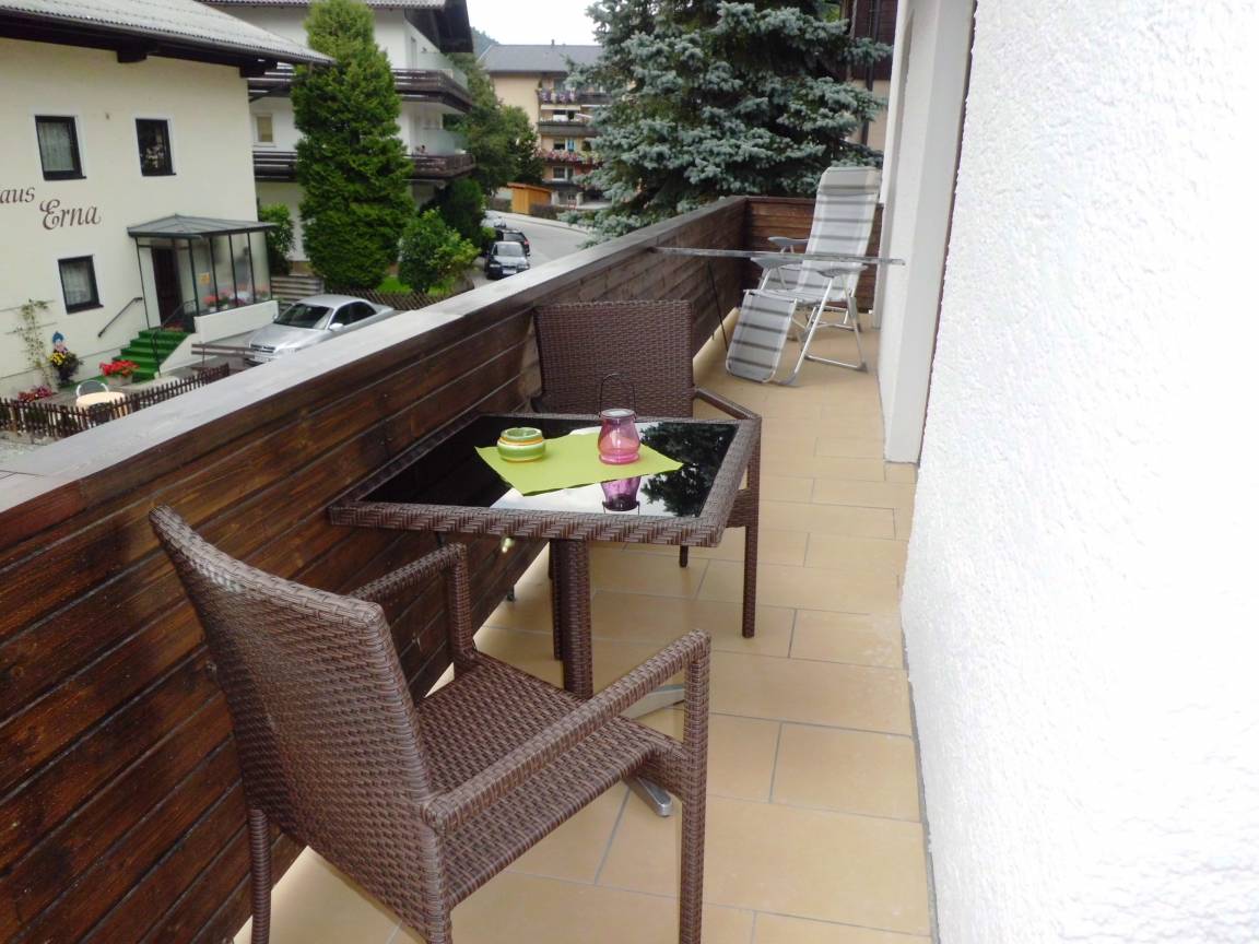 Die Wohnung hat einen schönen Balkon, auf der Sie eine Sitzgarnitur und Sonnenliegen finden. Die Aussicht auf die Bergwelt ist von hier grandios.