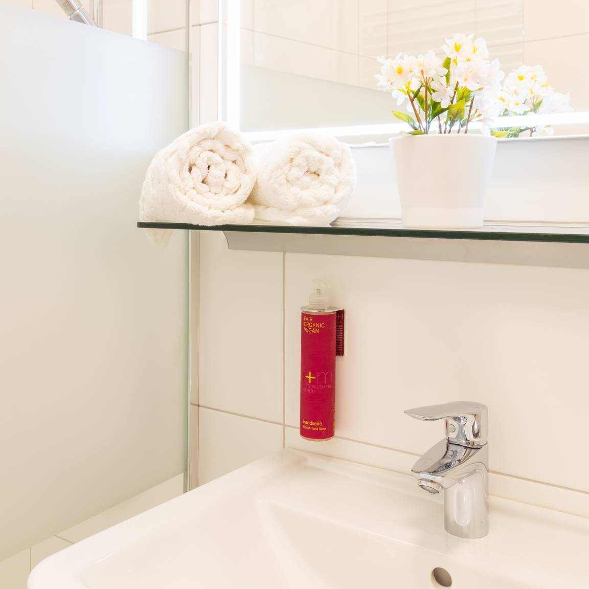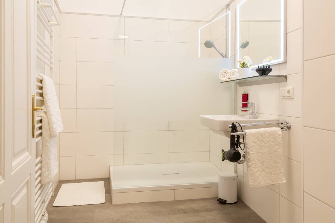 Das 2020 neu installierte Bad glänzt mit 'Walk-In' Dusche, Waschbecken, und sämtlicher Ausstattung inkl. Handtücher, Seife, Duschgel und Föhn. Genießen Sie Ihre ganz private Wohlfühloase.