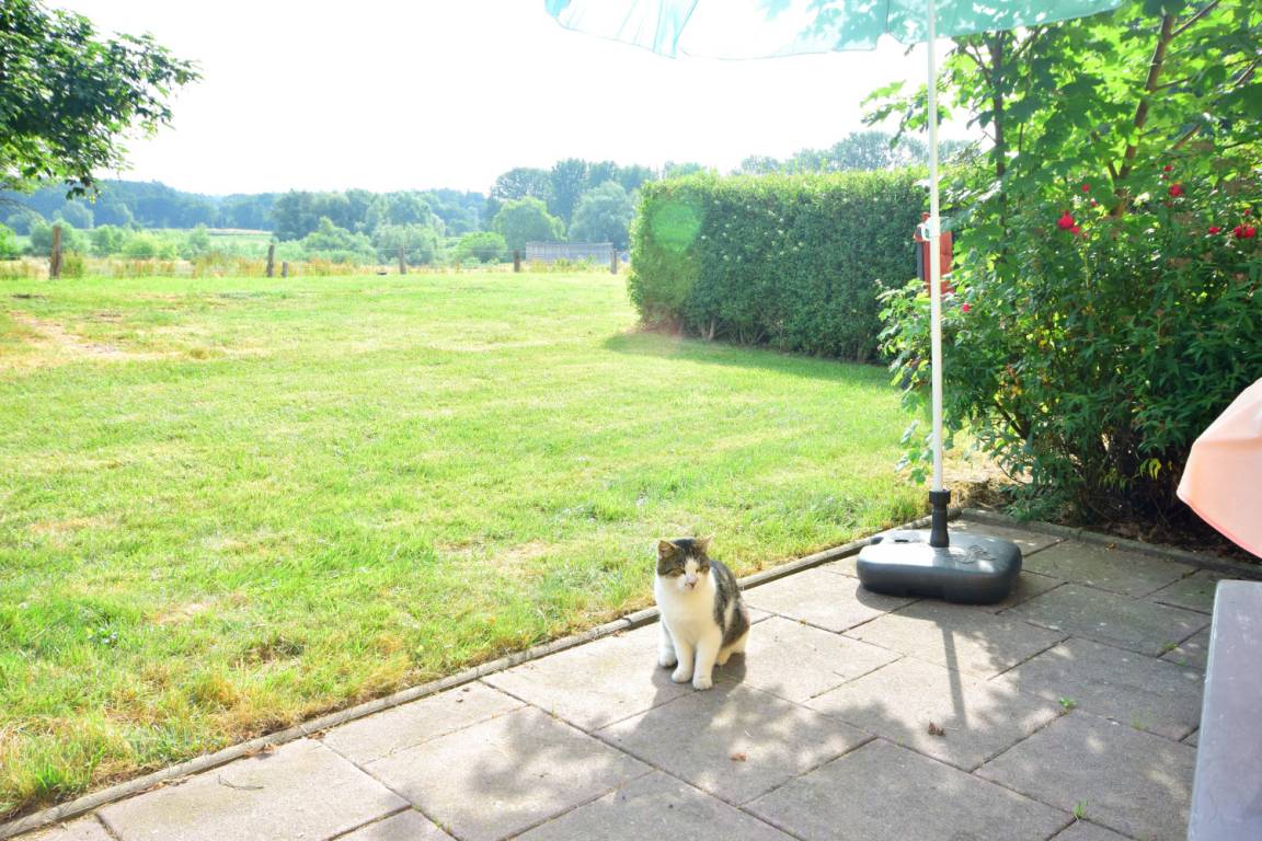 Vom Wohnbereich gelangen Sie auf die große Terrasse, mit angrenzender Wiese. Genießen Sie den Blick bis über die Felder und Rinderweide bis zum Horizont. Sonnenliegen, Grill und Sitzmöglichkeiten sind vorhanden. Ihren PKW und Ihre Fahrräder können Sie auf dem Grundstück überdacht abstellen. Die Ferienwohnung befindet sich auf einem Bauernhof (Grünlandbetrieb und Rinderhaltung im Nebenerwerb).