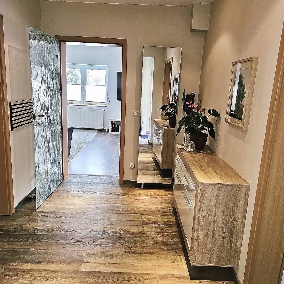 Die Ferienwohnung verfügt über einen großen Flurbereich teilweise gefliest und im Wohnbereich mit Laminatboden ausgestattet.