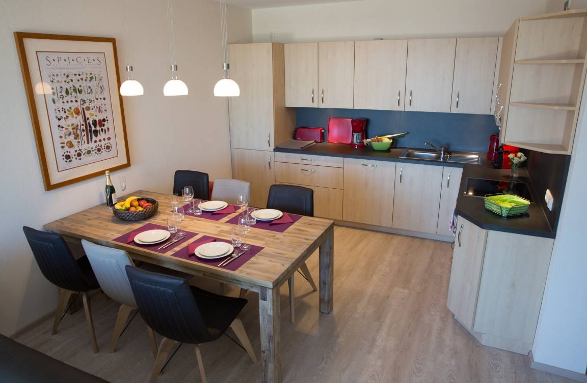 Den größten Raum nimmt der Wohnbereich mit umfangreich ausgestatteter, offener Küche ein. Das Ledersofa im Wohnbereich lässt sich bei Bedarf einfach und schnell in ein weiteres Doppelbett verwandeln. Im Übrigen können Sie im Wohnbereich einem großen HD Fernseher, einen Blue-Ray- und DVD - Spieler sowie eine Stereoanlage und eine kleine Handbibliothek zum Thema Berge und Reisen nutzen.