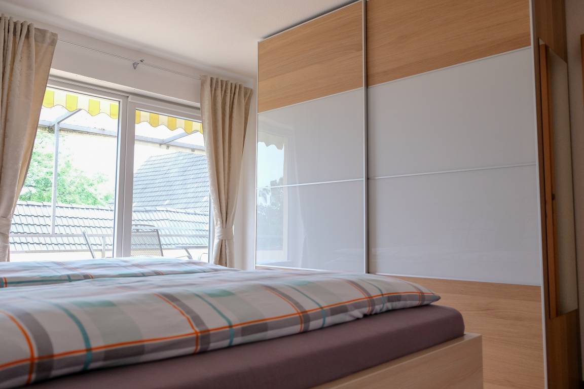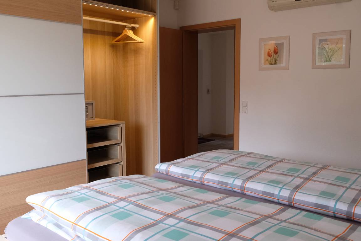 Im Schlafzimmer steht ein 2x2m großes Bett mit getrennten Matratzen und verstellbaren Lattenrosten. Weiterhin befindet sich im Schlafzimmer ein großer Schrank mit eingebautem Tresor (gebührenfrei).