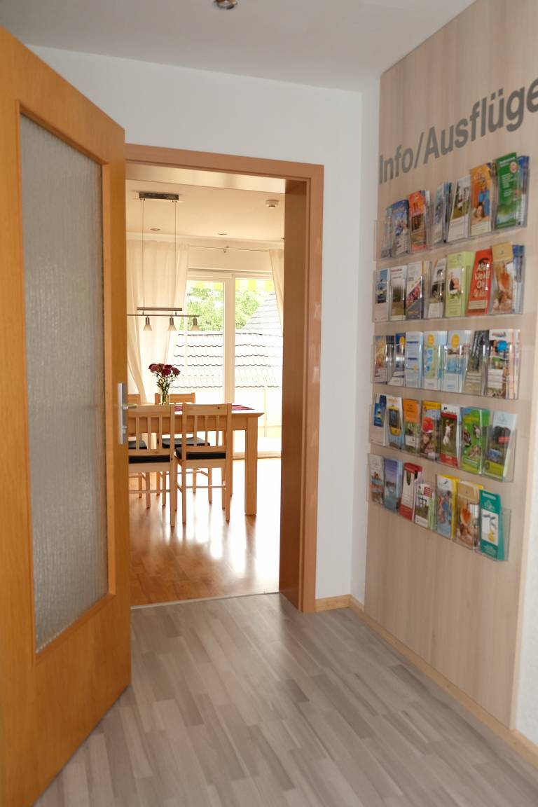 Eine große Infowand mit Infomaterial für viele schöne Ausflüge in der Umgebung gibt es im Flur.