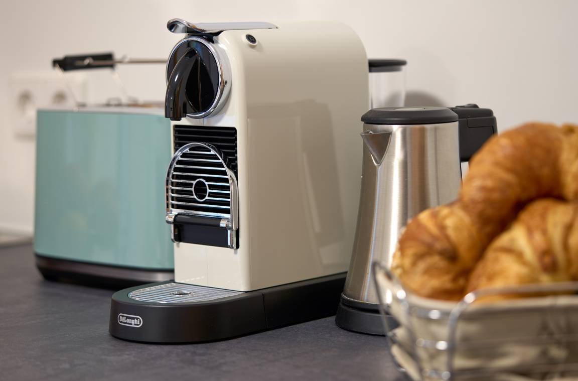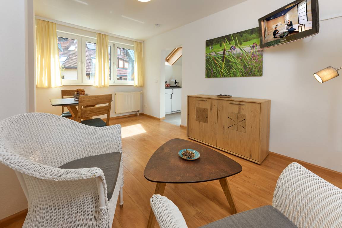 Das Appartement befindet sich im 2. OG. Es ist ein Zweiraumappartement, welches aber offen gestaltet ist. Die Räume sind voneinander nicht mit einer Tür abgetrennt. Im Schlafzimmer ist ein hochwertiges Boxspringbett. Vom Schlafzimmer aus haben Sie den Zugang ins Bad. Zwischen dem Schlafzimmer und dem Wohnzimmer befindet sich eine kleine Küchenzeile. Es steht Ihnen ein 2 Plattenherd, ein Kühlschrank mit Gefrierfach, ein Toaster, ein Wasserkocher und eine Nespressokaffeemaschine zur Verfügung. Im Wohnzimmer gibt es eine gemütliche Ecke mit Schlafsofa, um z.B. das TV zu schauen und eine Essecke. Das Appartement ist hell und geschmackvoll eingerichtet. Es ist Richtung Osten ausgerichtet. Eine abschliessbare und sichere Fahrradgarage für E-Bikes und andere Fahrräder ist vorhanden.