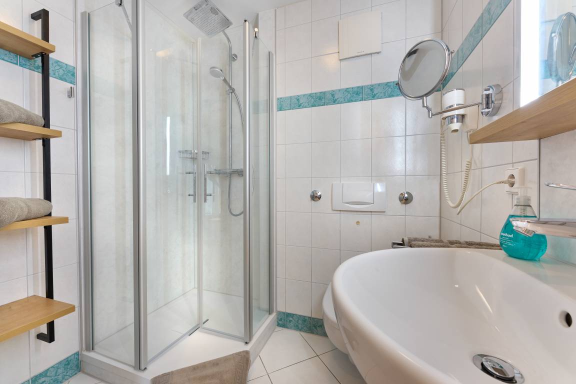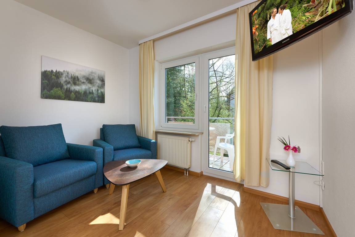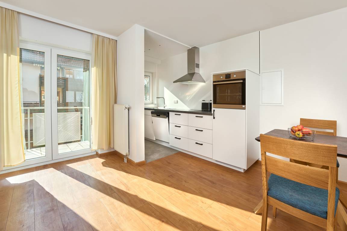 Das Appartement befindet sich im 1. OG.über die ganze Länge des Appartements gibt es einen sonnigen Balkon, der Richtung Osten situiert ist. Das Wohnzimmer ist im Schlafzimmer integriert. 2 bequeme Sessel lassen Sie sehr gut entspannen. Das Doppelbett ist ein hochwertiges Boxspringbett. Der Wohn-Schlafraum ist von der Wohnküche mit einer Tür abgetrennt. In der Küche gibt es eine Nespressokaffeemaschine, Geschirrspülmaschine, Kühlschrank mit einem Gefrierfach, Herd mit Backofen, ein Wasserkocher und ein Toaster. Die Einrichtung wie auch die Accessoires sind sehr eng mit der Destination Schwarzwald verknüpft. Diese Atmosphäre, die im Appartement zu bewundern und spüren gibt, lässt den Gast richtig entspannen. Die Holzart im Appartement ist die Asteiche. Eine abschliessbare und sichere Fahrradgarage für E-Bikes und andere Fahrräder ist vorhanden.