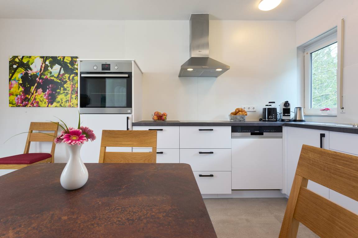 Das Appartement befindet sich im 1. OG. Die Küche hat einen Balkon, der Richtung Osten situiert ist. Das Wohn-Schlafzimmer einen Balkon, der Richtung Süden situiert ist. Es ist ein offenes, helles Appartement, in welchem Schlafzimmer im Wohnzimmer integriert ist. Die vollausgestattete Küche ist zwar separat, aber nicht von Wohn- und Schlafraum mit einer Tür abgetrennt. Das Doppelbett ist ein hochwertiges Boxspringbett. In diesem Raum befindet sich auch ein hochwertiges Schlafsofa. In der Küche gibt es eine Nespressokaffeemaschine, ein Kühlschrank mit einem Gefrierfach, eine Geschirrspülmaschine, ein Herd mit Backofen, ein Wasserkocher und ein Toaster. Die Einrichtung wie auch die Accessoires sind sehr eng mit dem Thema Wein verknüpft. Diese Atmosphäre, die im Appartement zu bewundern und spüren gibt, lässt den Gast richtig entspannen. Die Holzart im Appartement ist die Asteiche. Eine abschliessbare und sichere Fahrradgarage für E-Bikes und andere Fahrräder ist vorhanden.
