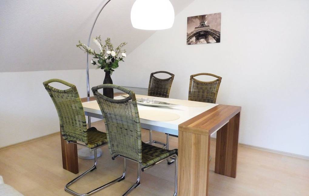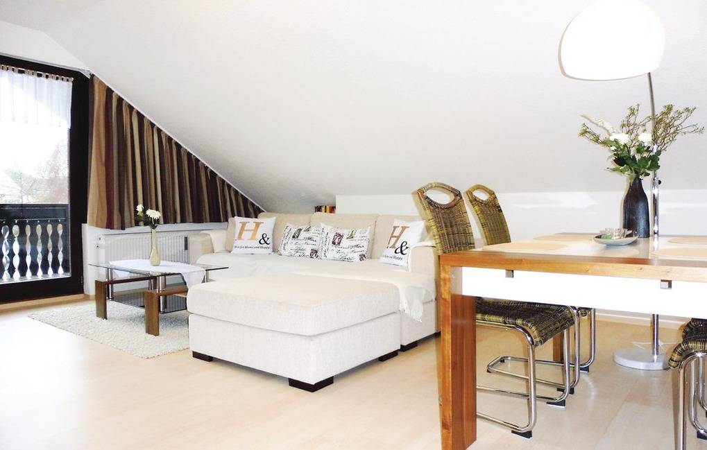 Die Ferienwohnung liegt im Obergeschoss (Dachgeschoss) des Hauses mit großem Südbalkon. Das Wohnzimmer mit Essplatz und die vollausgestattete Küche mit Spülmaschine sowie die beiden geräumigen Schlafzimmer bieten viel Platz für 4 Personen. Im Badezimmer steht neben Dusche und Badewanne auch eine Waschmaschine zur Verfügung.