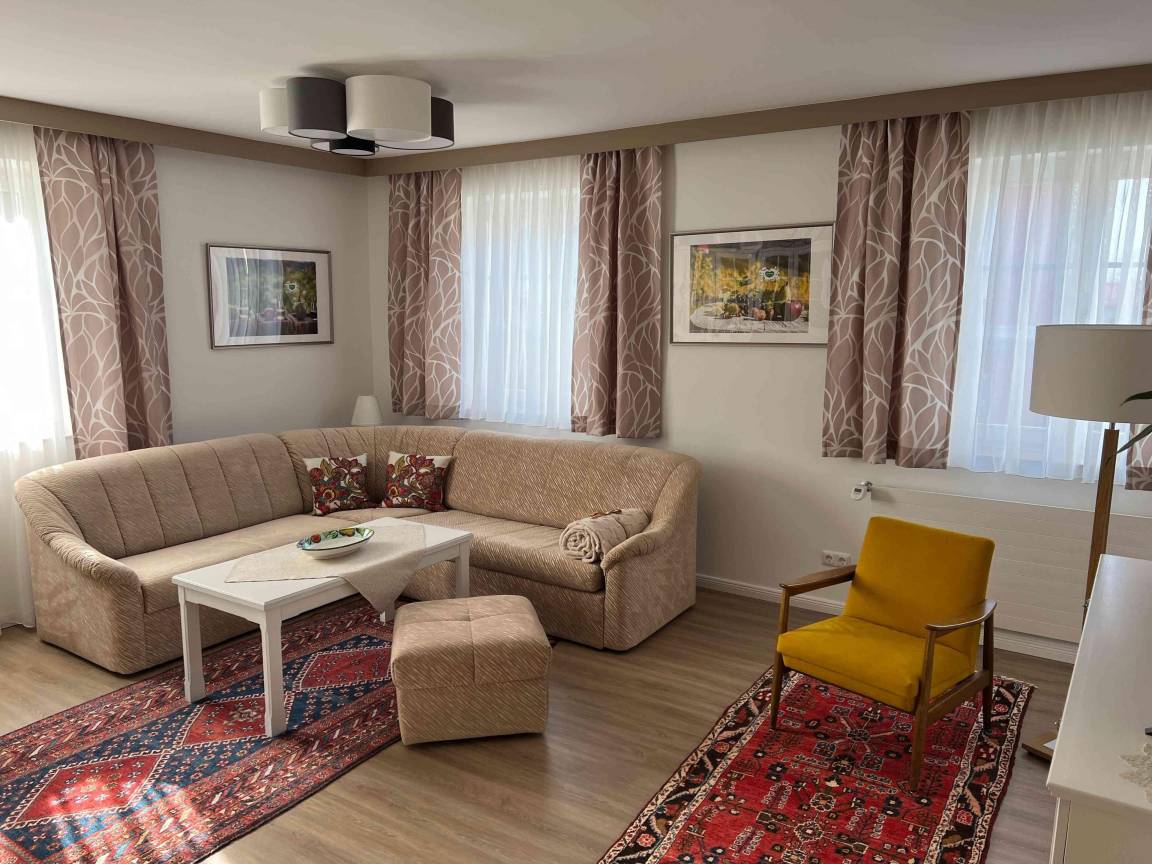 Dieses überaus geräumige Apartment verfügt über ein Schlafzimmer, ein sehr großes Wohnzimmer mit Einbaumöbeln und Doppelcouch, ein Kabinett (Extra-Zimmer), eine große gemütliche Holz-Küche mit Eckbank, ein Bad (Wanne), ein WC (getrennt) und eine große Diele/Vorzimmer. Bewährtes und gediegene, traditionelle Tischlerarbeit wurden mit Komfort und Neuem für liebe Gäste kombiniert.
