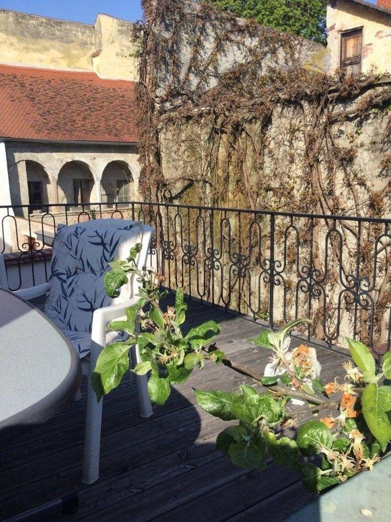Die abgeschlossene Wohnung – Apartment „Weißburgunder" – ist komplett eingerichtet, gediegen mit Echtholz-Einbaumöbeln und extra viel Stauraum für längere Aufenthalte, mehr Gepäck oder Gruppen. Über den breiten Stiegenaufgang gelangen Sie in den 1. Stock. Das Besondere ist die große eigene Terrasse mit Markise in einen der interessantesten Bad Radkersburger Innenhöfe sowie der Ausblick auf die Kirche, Musikschule und die Pfarrgasse.