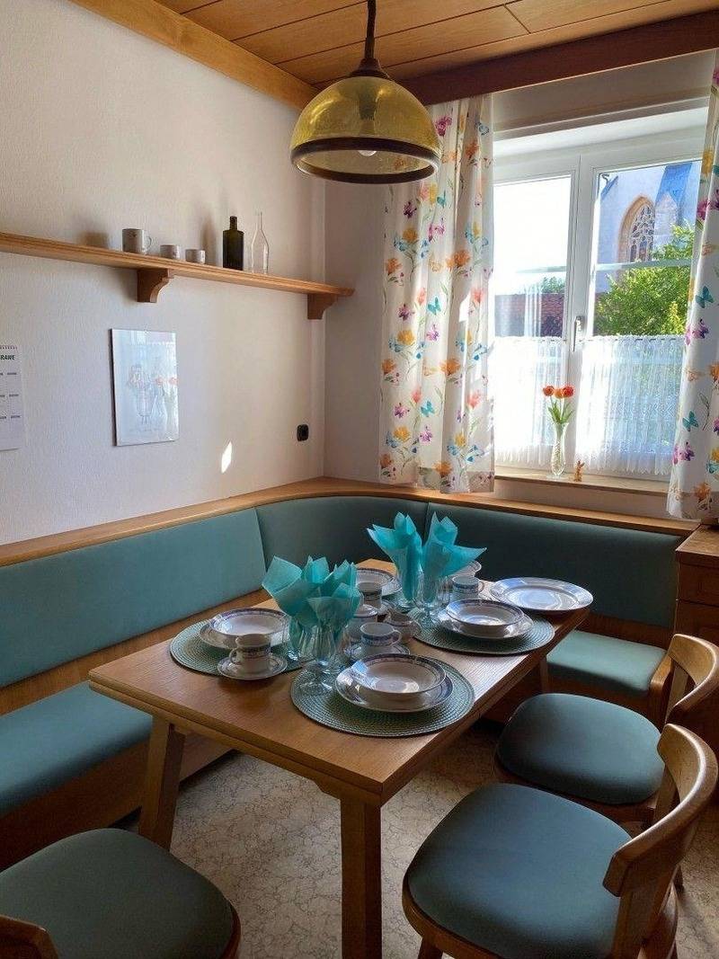 • Essbereich mit gepolsterter Eckbank, Tisch und Sesseln.