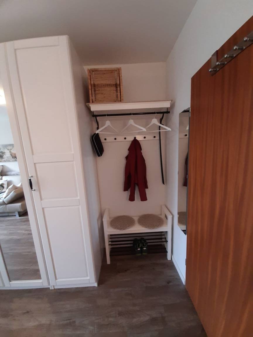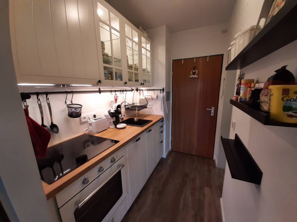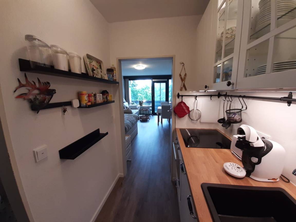 Die gemütliche und komfortable Einzimmer-Ferienwohnung verfügt über eine komfortable Küche mit Geschirrspüler, Herd und Backofen im Flur. Kühlschrank und Mikrowelle stehen neben der Essecke.