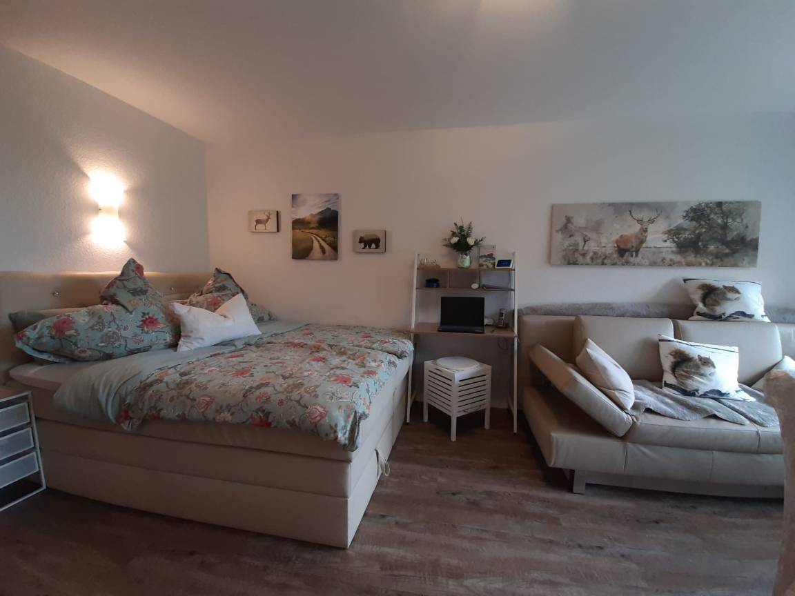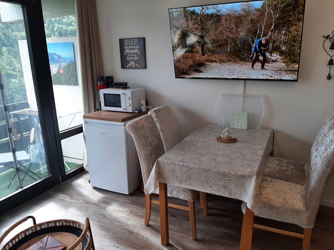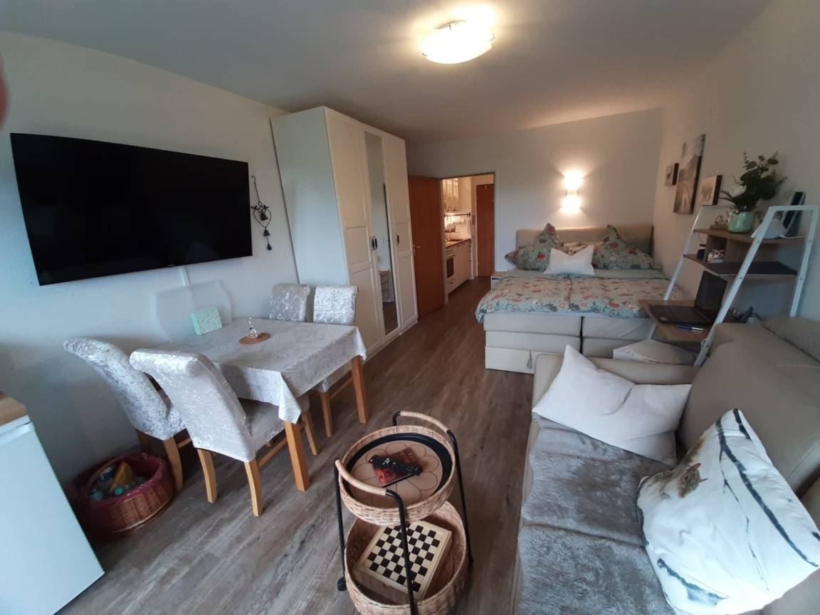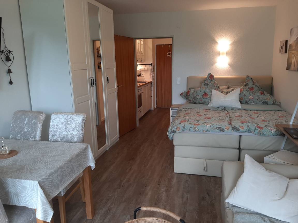 Die gemütliche und komfortable Einzimmer-Ferienwohnung verfügt über eine komfortable Küche mit Geschirrspüler, Herd und Backofen im Flur. Kühlschrank und Mikrowelle stehen neben der Essecke.