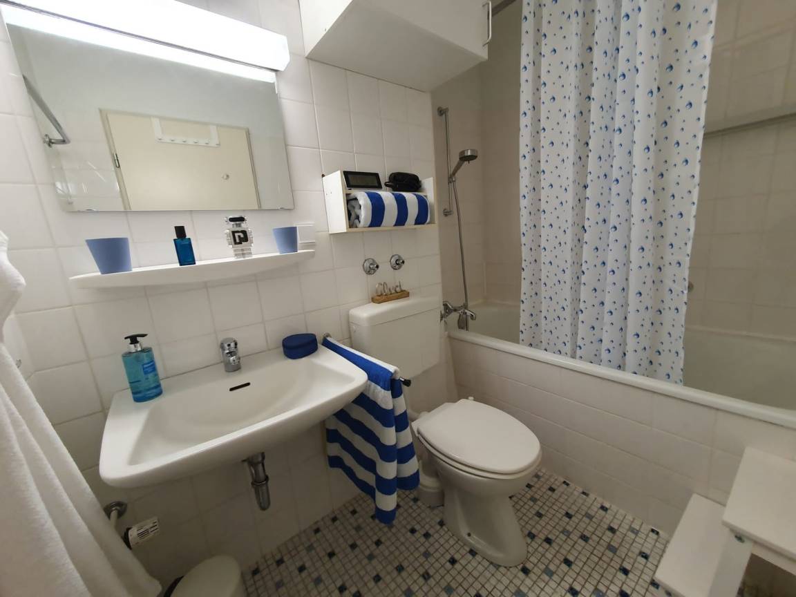 Das Bad ist mit Toilette, Badewanne und Waschbecken ausgestattet.