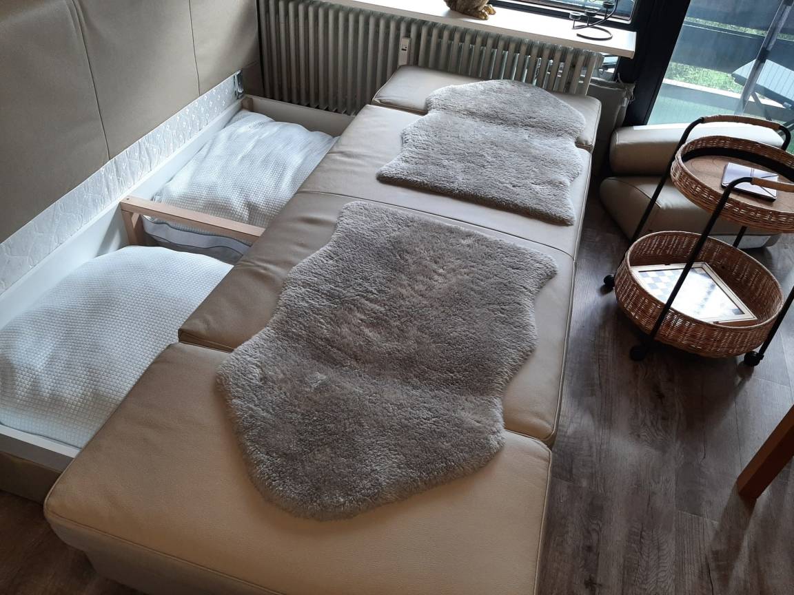Schlafen werden Sie im 160cm breiten Boxspringbett mit Topper oder auf der Leder-Schlafcoach, die sich auf 150cm ausziehen lässt.