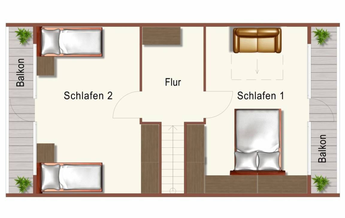 Beide Schlafzimmer befinden sich im ersten Stock und verfügen über einen kleinen Balkon. Das erste Schlafzimmer ist mit einem großen Doppelbett ausgestattet - hier befindet sich auch eine Schlafcouch auf der zwei Personen bequem Platz finden. Im zweiten Schlafzimmer finden Sie 2 bequeme Einzelbetten.