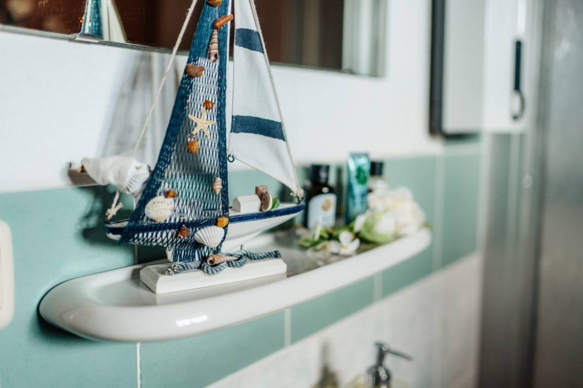 Das großzügige Badezimmer ist mit einer Dusche und genügend Stauraum ausgestattet.