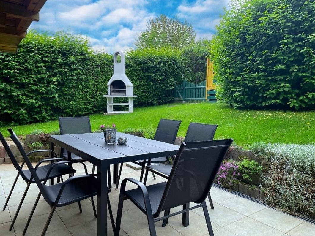 Das Blockhaus ist komplett mit einem ca 80 cm hohen Zaun eingezäunt. Die nach Süden ausgerichtete Terrasse eignet sich hervorragend zum entspannen, sonnenbaden oder grillen. Gartenmöbel stehen kostenlos zur Verfügung.