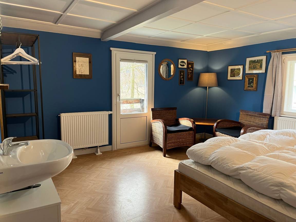 Das Ferienhaus Nicklas liegt an einem kleinen Vorgarten direkt an der Elbe. Das Haus hat 2 Etagen: im unteren Bereich (mit eigener Terrasse) sind Wohnzimmer und Küchenecke. Über einen separaten Aufgang gelangt man zu Dusche und separatem WC und den beiden Schlafzimmern im Obergeschoss, wo man vom Balkon die beste Aussicht genießt. Das große Schlafzimmer hat ein Doppelbett, ein eigenes Waschbecken. Das kleine Schlafzimmer hat 2 Einzelbetten und ebenfalls ein Waschbecken.